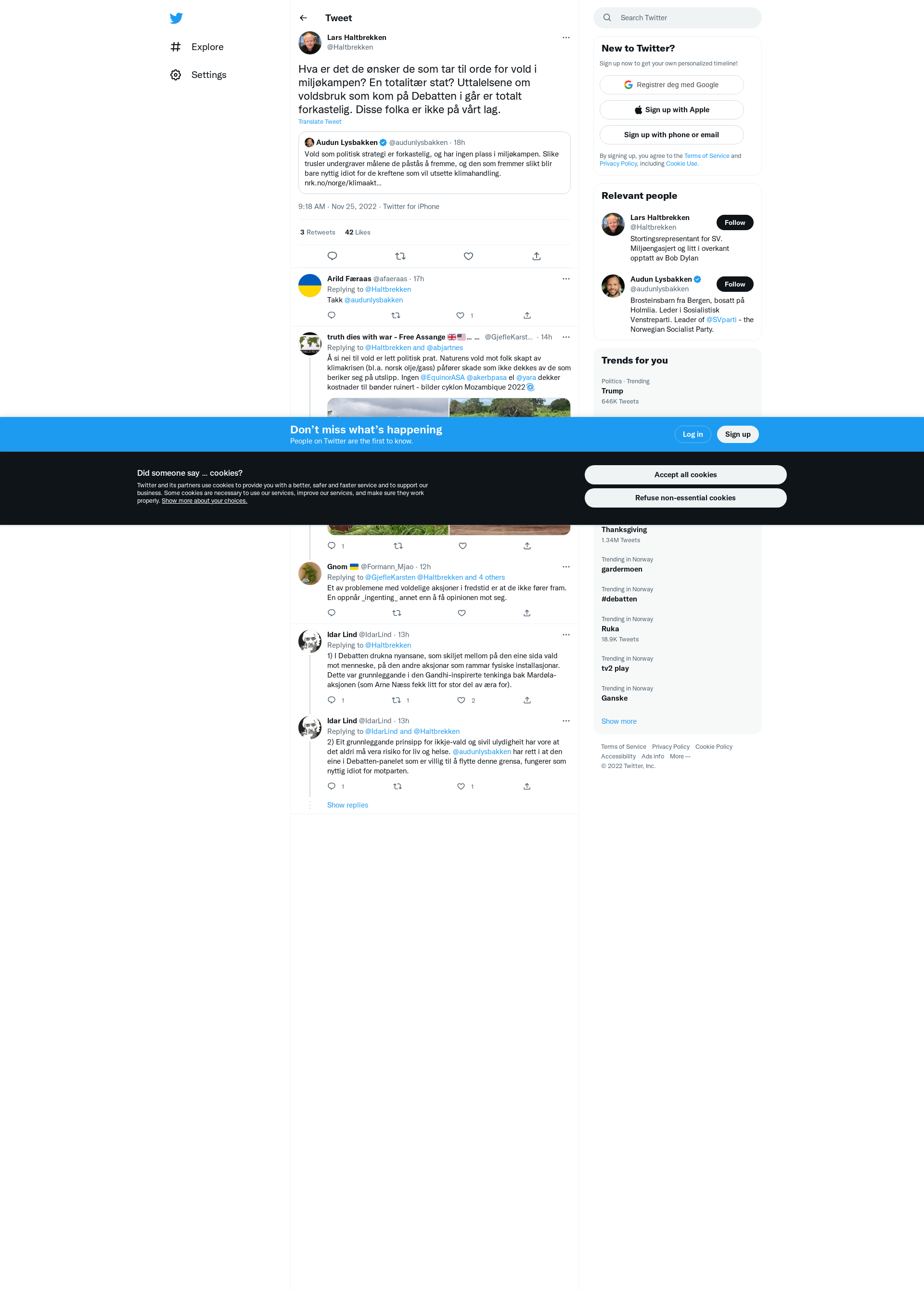 Hva er det de ønsker de som tar til orde for vold i miljøkampen? En totalitær stat? Uttalelsene om voldsbruk som kom på Debatten i går er totalt forkastelig. Disse folka er ikke på vårt lag.