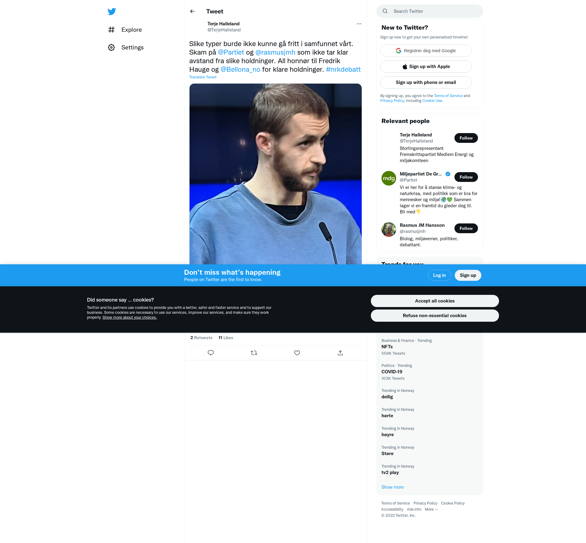 Slike typer burde ikke kunne gå fritt i samfunnet vårt. Skam på @Partiet og @rasmusjmh som ikke tar klar avstand fra slike holdninger. All honnør til Fredrik Hauge og @Bellona_no for klare holdninger. #nrkdebatt https://t.co/z6oXdVzbA7