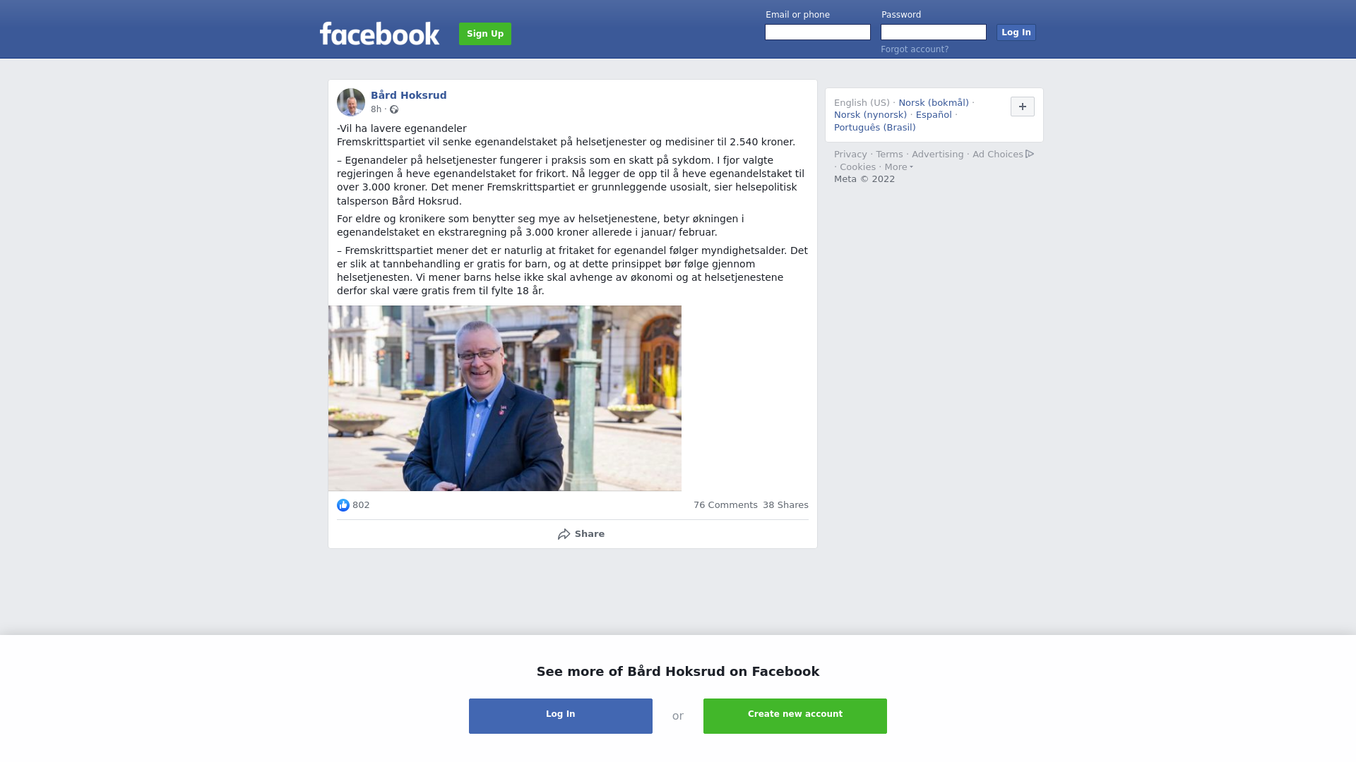 -Vil ha lavere egenandeler\nFremskrittspartiet vil senke egenandelstaket på helsetjenester og medisiner til 2.540 kroner.\n\n– Egenandeler på helsetjenester fungerer i praksis som en skatt på sykdom. I fjor valgte regjeringen å heve egenandelstaket for frikort. Nå legger de opp til å heve egenandelstaket til over 3.000 kroner. Det mener Fremskrittspartiet er grunnleggende usosialt, sier helsepolitisk talsperson Bård Hoksrud.\n\nFor eldre og kronikere som benytter seg mye av helsetjenestene, betyr økningen i egenandelstaket en ekstraregning på 3.000 kroner allerede i januar/ februar.\n\n– Fremskrittspartiet mener det er naturlig at fritaket for egenandel følger myndighetsalder. Det er slik at tannbehandling er gratis for barn, og at dette prinsippet bør følge gjennom helsetjenesten. Vi mener barns helse ikke skal avhenge av økonomi og at helsetjenestene derfor skal være gratis frem til fylte 18 år.