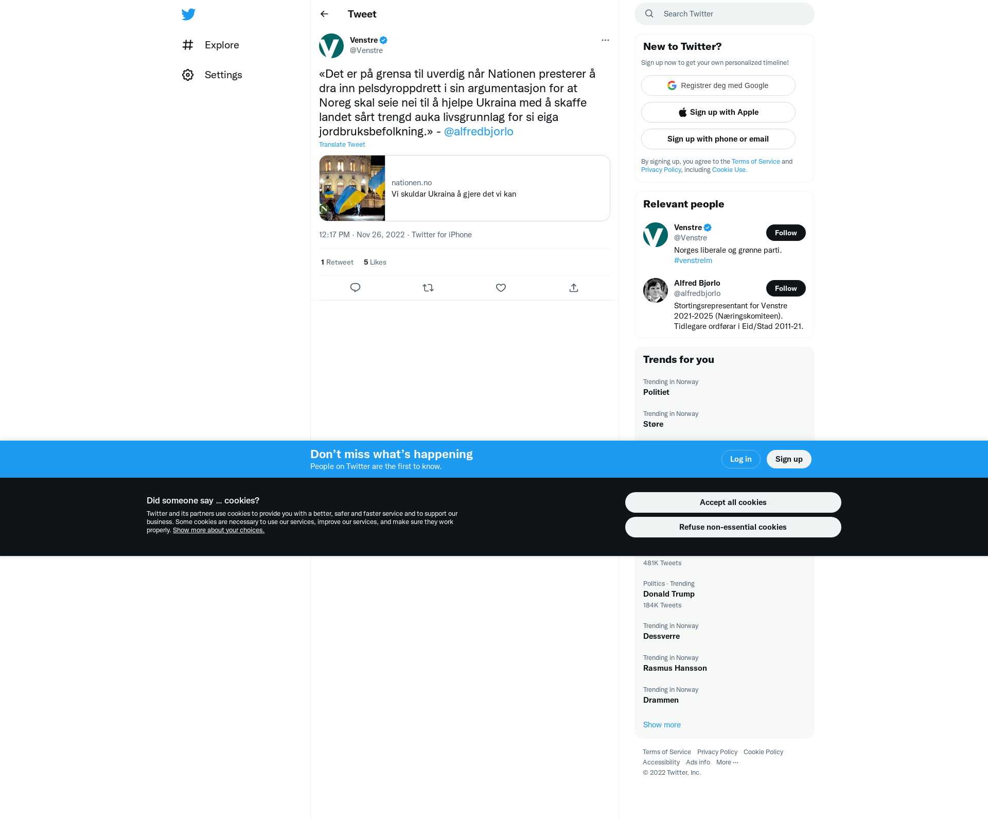 «Det er på grensa til uverdig når Nationen presterer å dra inn pelsdyroppdrett i sin argumentasjon for at Noreg skal seie nei til å hjelpe Ukraina med å skaffe landet sårt trengd auka livsgrunnlag for si eiga jordbruksbefolkning.» - @alfredbjorlo \nhttps://t.co/oZE89VcFsO
