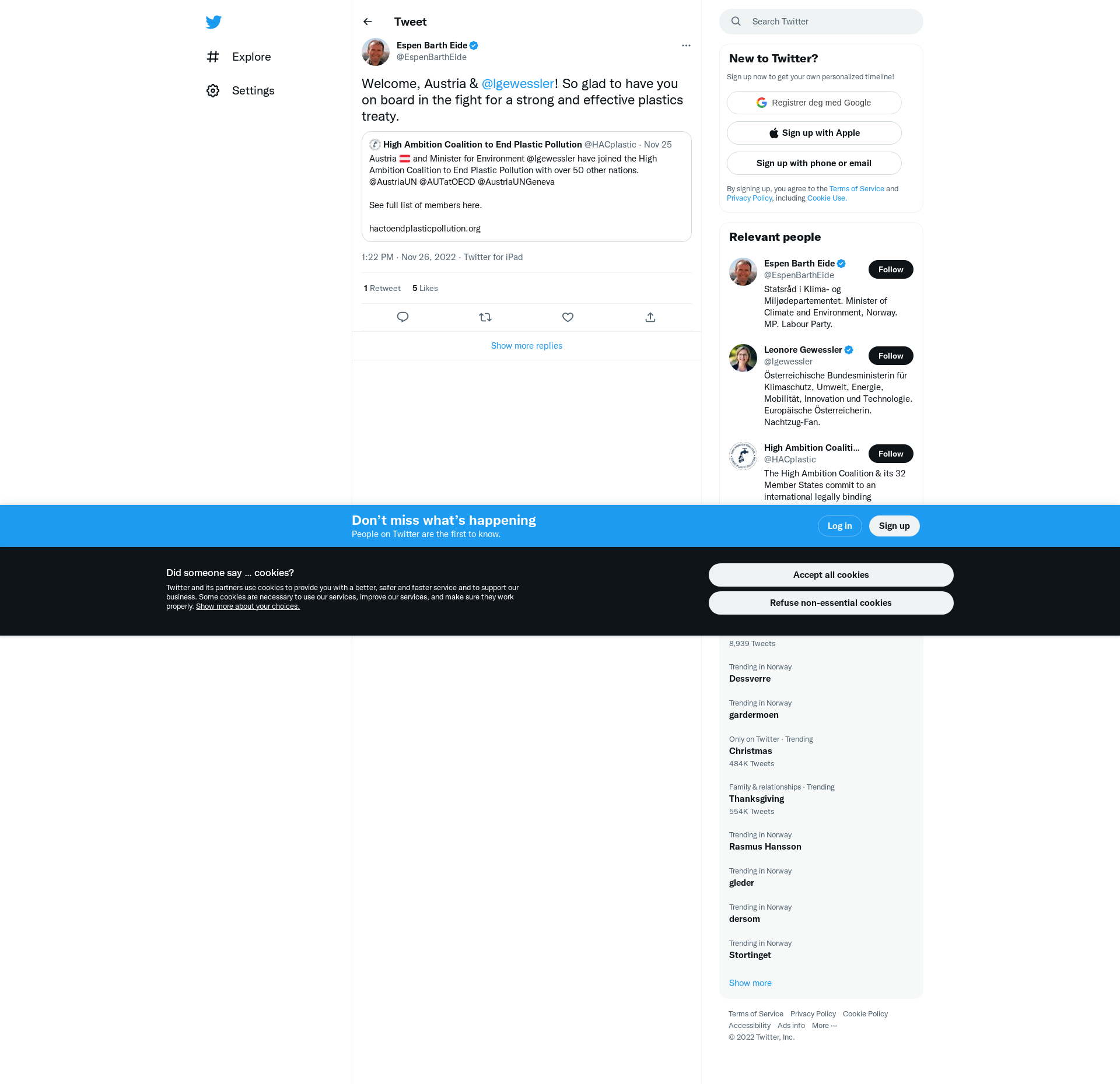 Plastic pollution constitutes a planetary crisis with impacts on ecosystems, biodiversity, the climate and human health. Without new and effective control measures, plastic production is set to double in 20 years and plastic waste leaking into the ocean is projected to triple by 2040. This is an unacceptable burden to place on future generations. We urge countries to come together to address the sources of plastic pollution and safeguard our planet. The High Ambition Coalition to End Plastic Pollution is