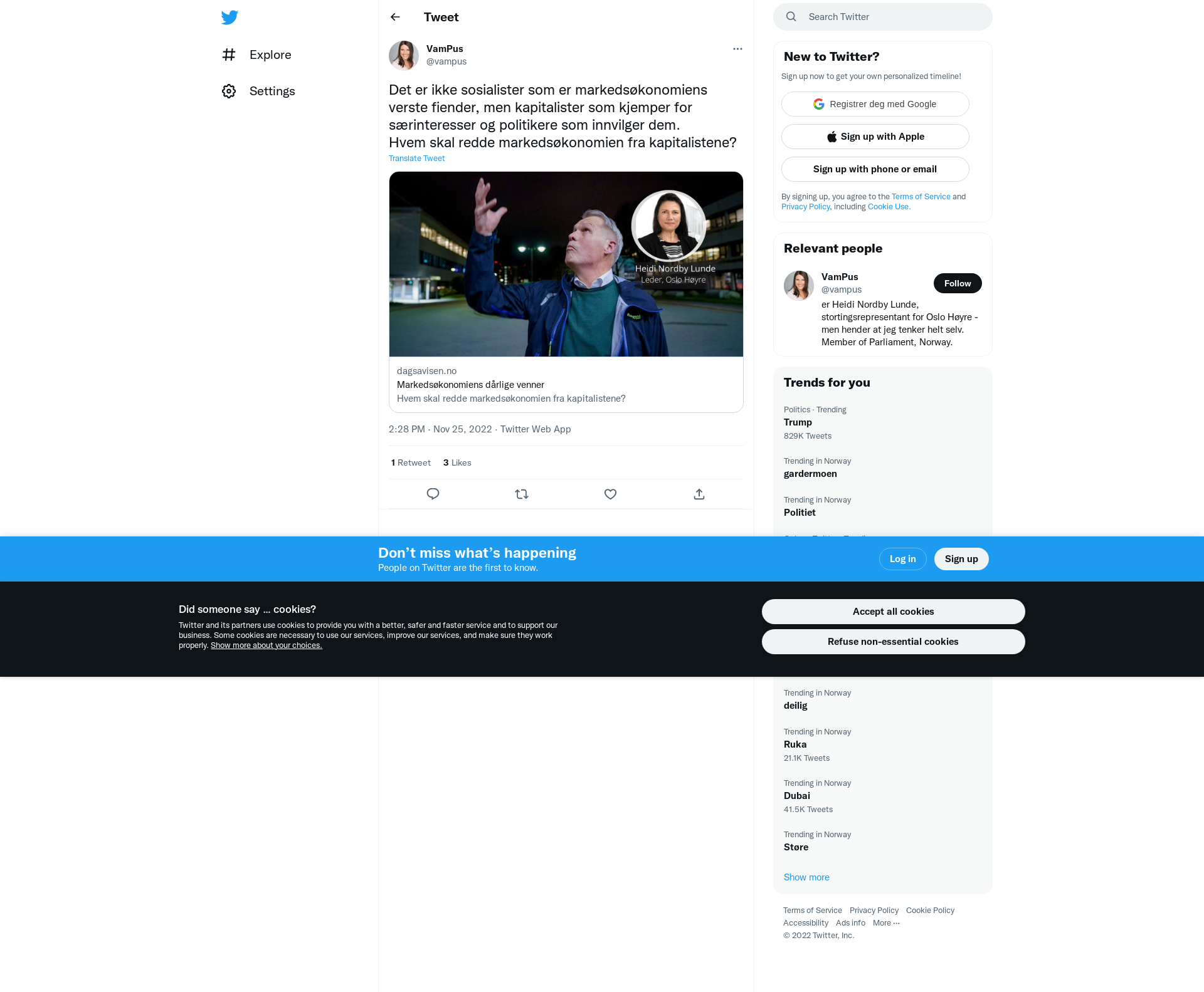 Det er ikke sosialister som er markedsøkonomiens verste fiender, men kapitalister som kjemper for særinteresser og politikere som innvilger dem.\nHvem skal redde markedsøkonomien fra kapitalistene?\nhttps://t.co/jGgKUrqkkl
