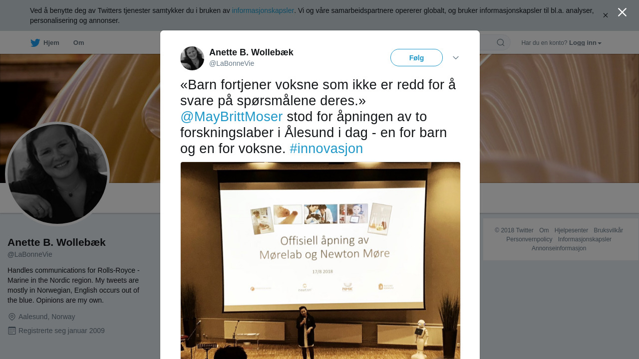RT @LaBonneVie: «Barn fortjener voksne som ikke er redd for å svare på spørsmålene deres.» @MayBrittMoser stod for åpningen av to forskningslaber i Ålesund i dag - en for barn og en for voksne. #innovasjon https://t.co/GKf76EKRe7