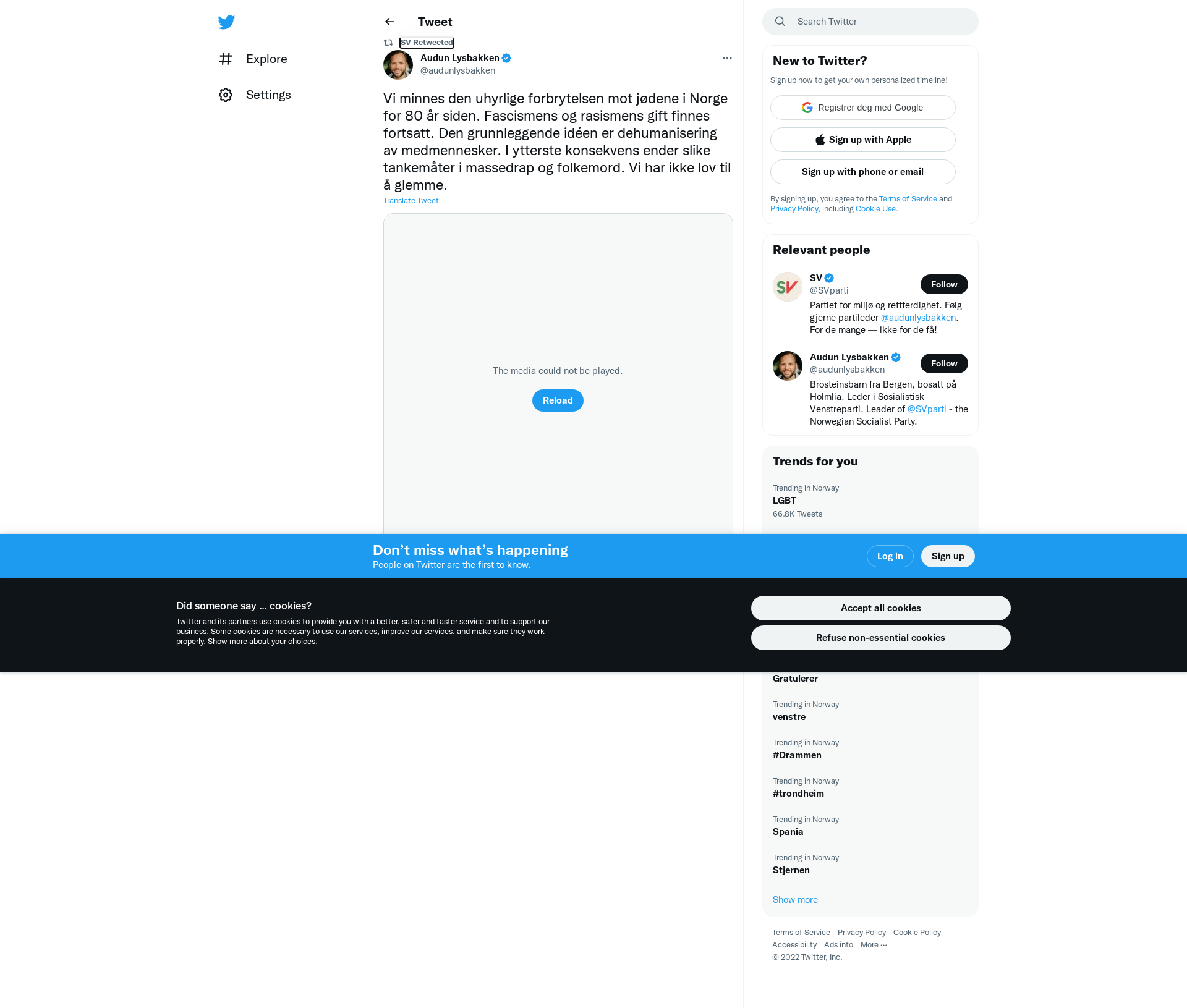 RT @audunlysbakken: Vi minnes den uhyrlige forbrytelsen mot jødene i Norge for 80 år siden. Fascismens og rasismens gift finnes fortsatt. Den grunnleggende idéen er dehumanisering av medmennesker. I ytterste konsekvens ender slike tankemåter i massedrap og folkemord. Vi har ikke lov til å glemme. https://t.co/TdM6t2dQMg