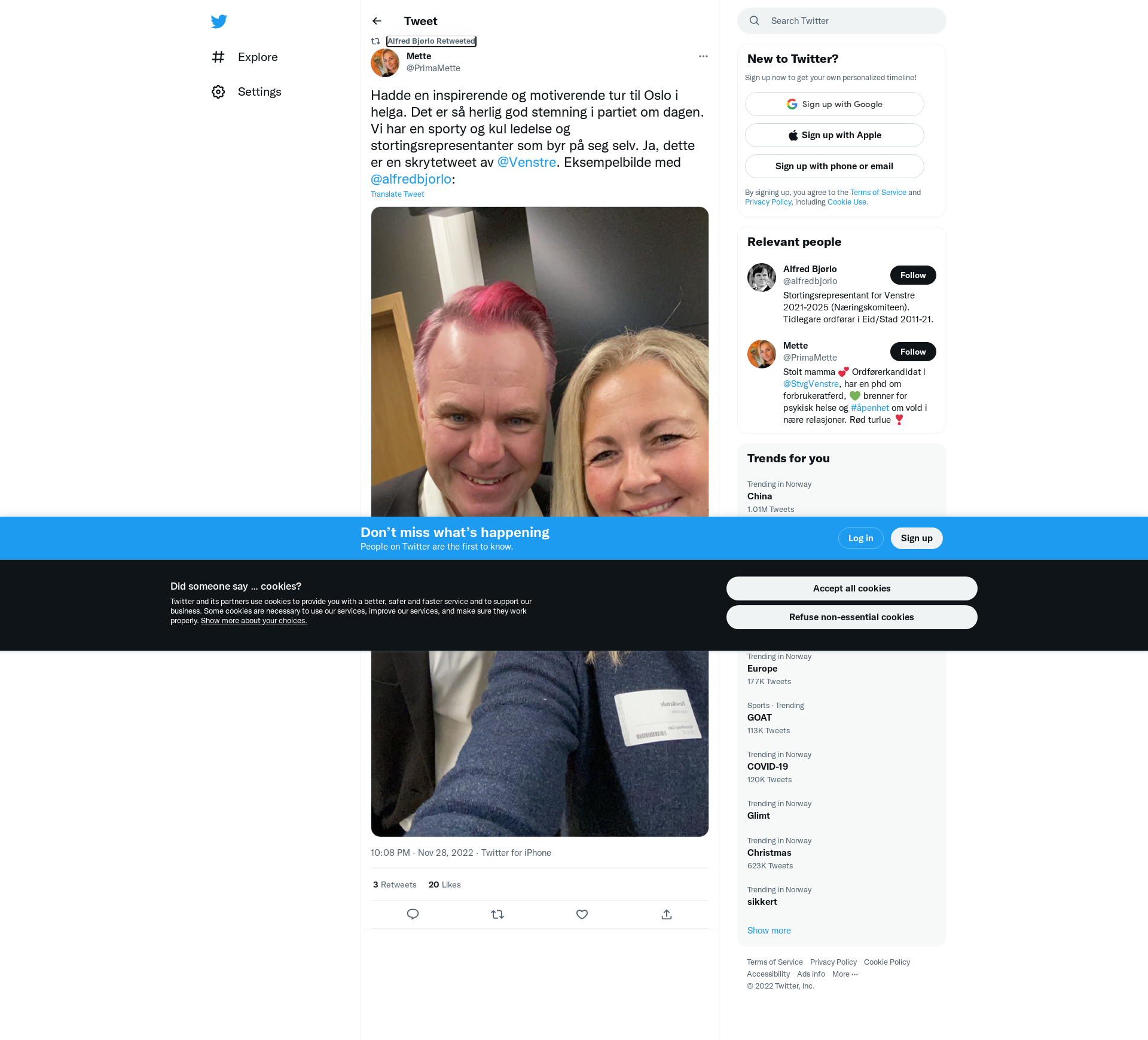 RT @PrimaMette: Hadde en inspirerende og motiverende tur til Oslo i helga. Det er så herlig god stemning i partiet om dagen. Vi har en sporty og kul ledelse og stortingsrepresentanter som byr på seg selv. Ja, dette er en skrytetweet av @Venstre. Eksempelbilde med @alfredbjorlo: https://t.co/5seR9zNBy1
