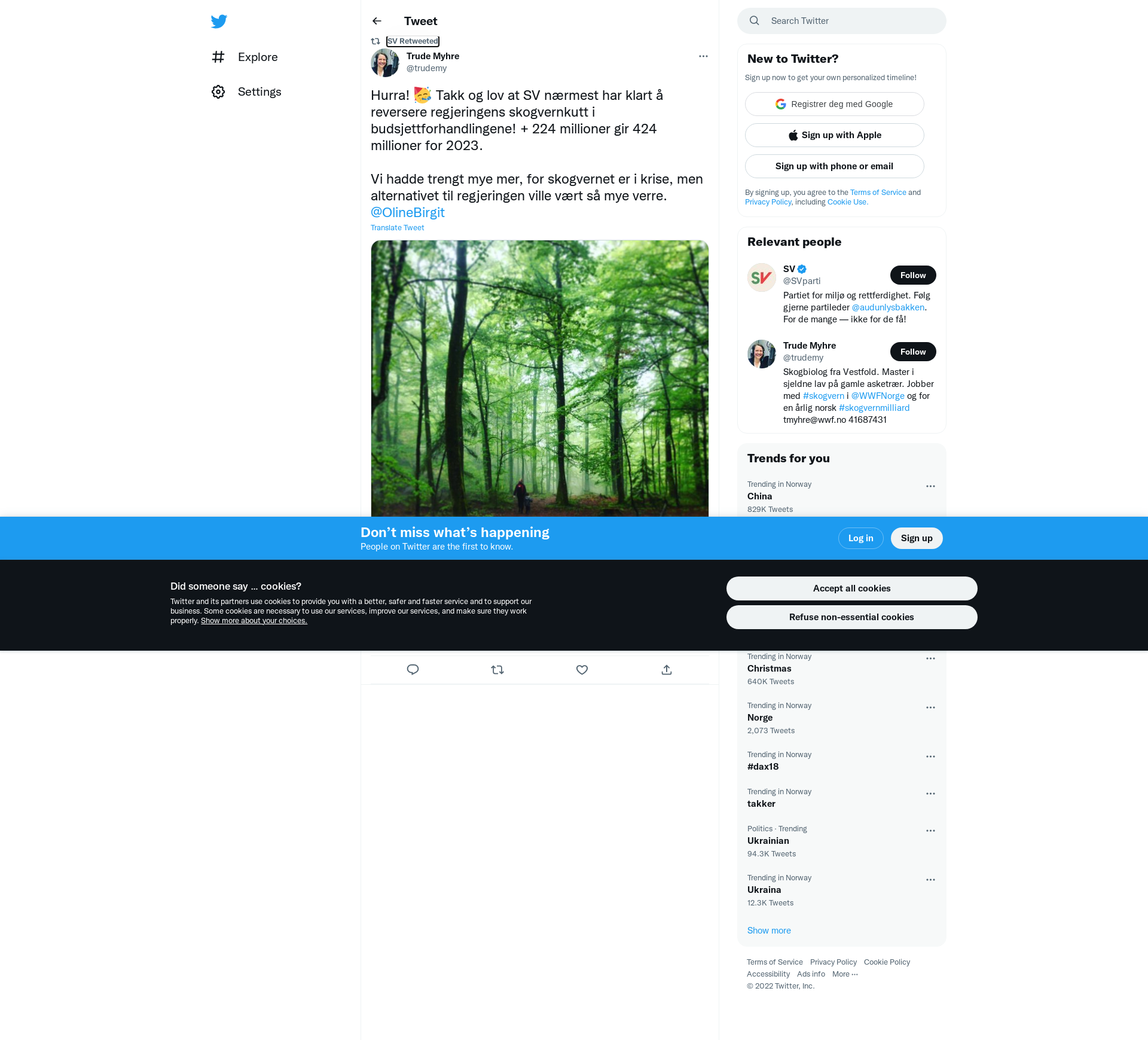 RT @trudemy: Hurra! 🥳 Takk og lov at SV nærmest har klart å reversere regjeringens skogvernkutt i budsjettforhandlingene! + 224 millioner gir 424 millioner for 2023. \n\nVi hadde trengt mye mer, for skogvernet er i krise, men alternativet til regjeringen ville vært så mye verre. @OlineBirgit https://t.co/atGrwtlnyJ