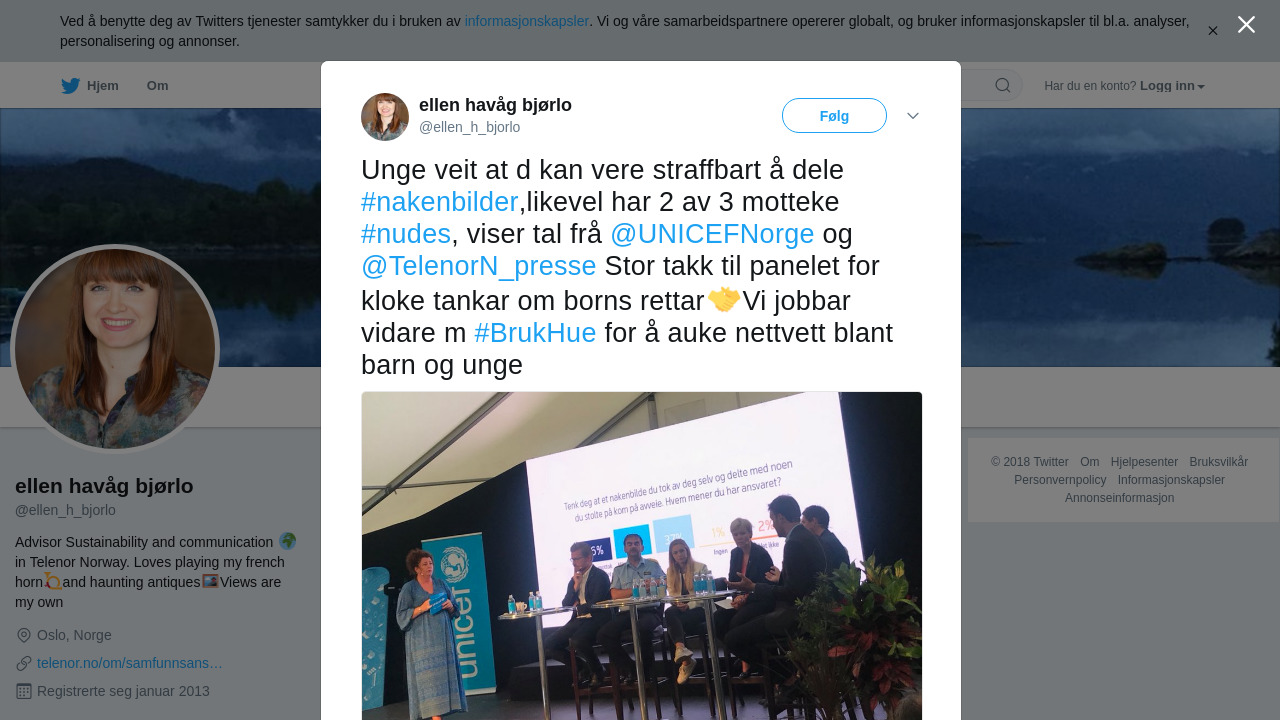 RT @ellen_h_bjorlo: Unge veit at d kan vere straffbart å dele #nakenbilder,likevel har 2 av 3 motteke #nudes, viser tal frå @UNICEFNorge og @TelenorN_presse Stor takk til panelet for kloke tankar om borns rettar🤝Vi jobbar vidare m #BrukHue for å auke nettvett blant barn og unge https://t.co/IdAq0xdJBf