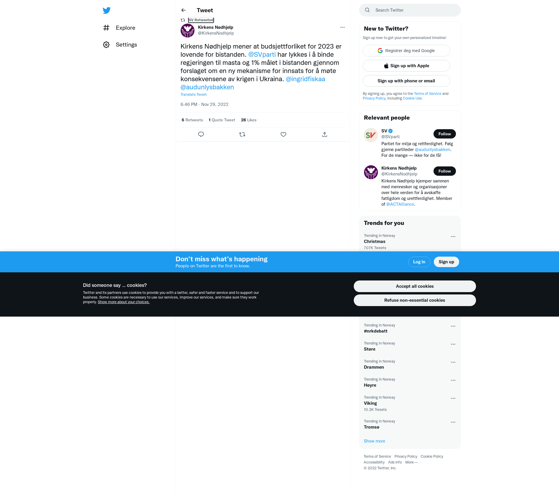 RT @KirkensNodhjelp: Kirkens Nødhjelp mener at budsjettforliket for 2023 er lovende for bistanden. @SVparti har lykkes i å binde regjeringen til masta og 1% målet i bistanden gjennom forslaget om en ny mekanisme for innsats for å møte konsekvensene av krigen i Ukraina. @ingridfiskaa @audunlysbakken