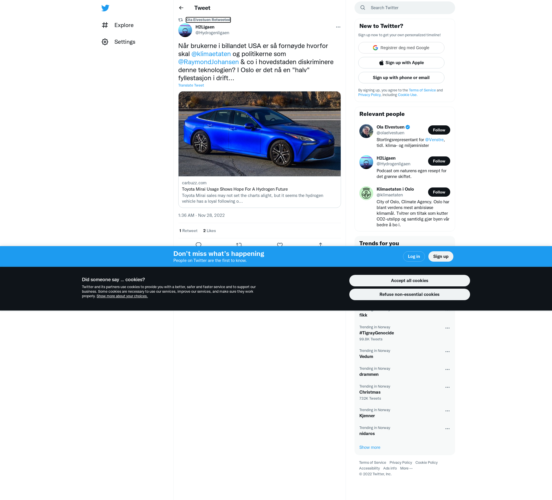 RT @Hydrogenligaen: Når brukerne i billandet USA er så fornøyde hvorfor skal @klimaetaten og politikerne som @RaymondJohansen & co i hovedstaden diskriminere denne teknologien? I Oslo er det nå en "halv" fyllestasjon i drift... https://t.co/OI6donqhtn
