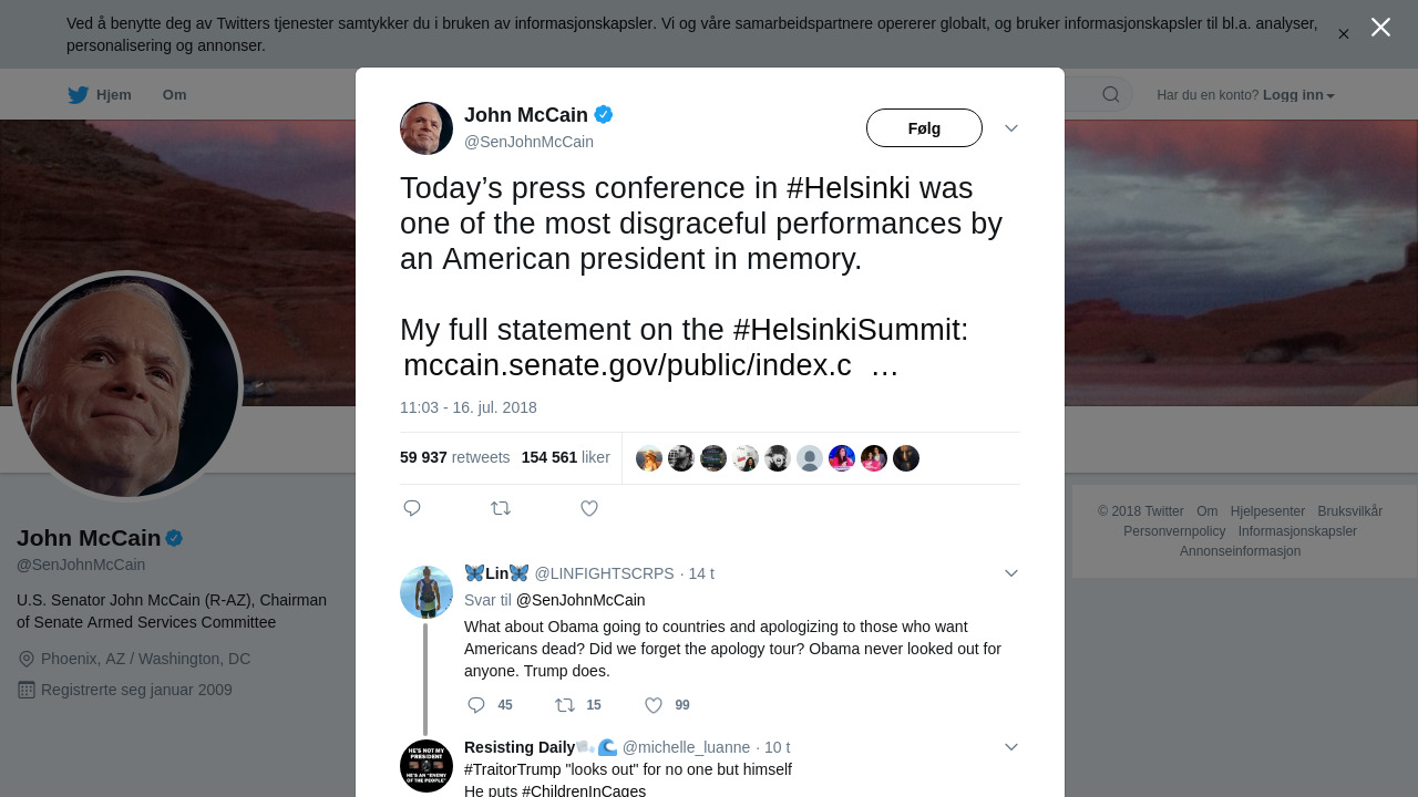 RT @SenJohnMcCain: Today’s press conference in #Helsinki was one of the most disgraceful performances by an American president in memo… https://t.co/CS9FXzjmjW
