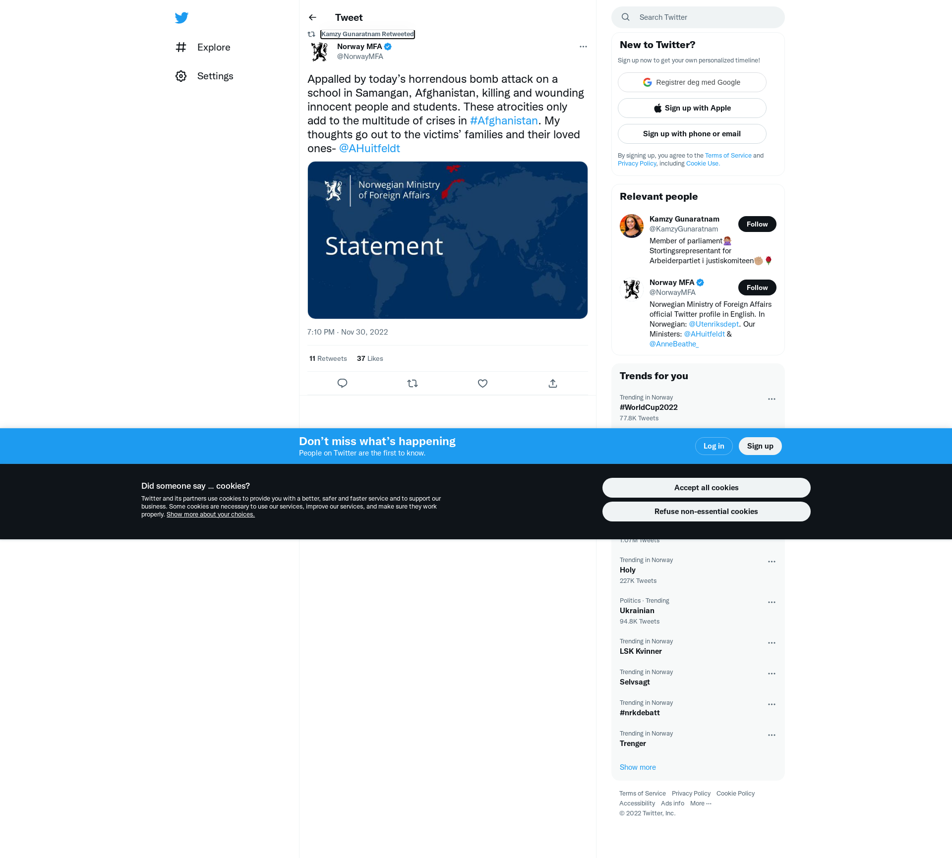 RT @NorwayMFA: Appalled by today’s horrendous bomb attack on a school in Samangan, Afghanistan, killing and wounding innocent people and students. These atrocities only add to the multitude of crises in #Afghanistan. My thoughts go out to the victims’ families and their loved ones- @AHuitfeldt https://t.co/XvgUN78BIx