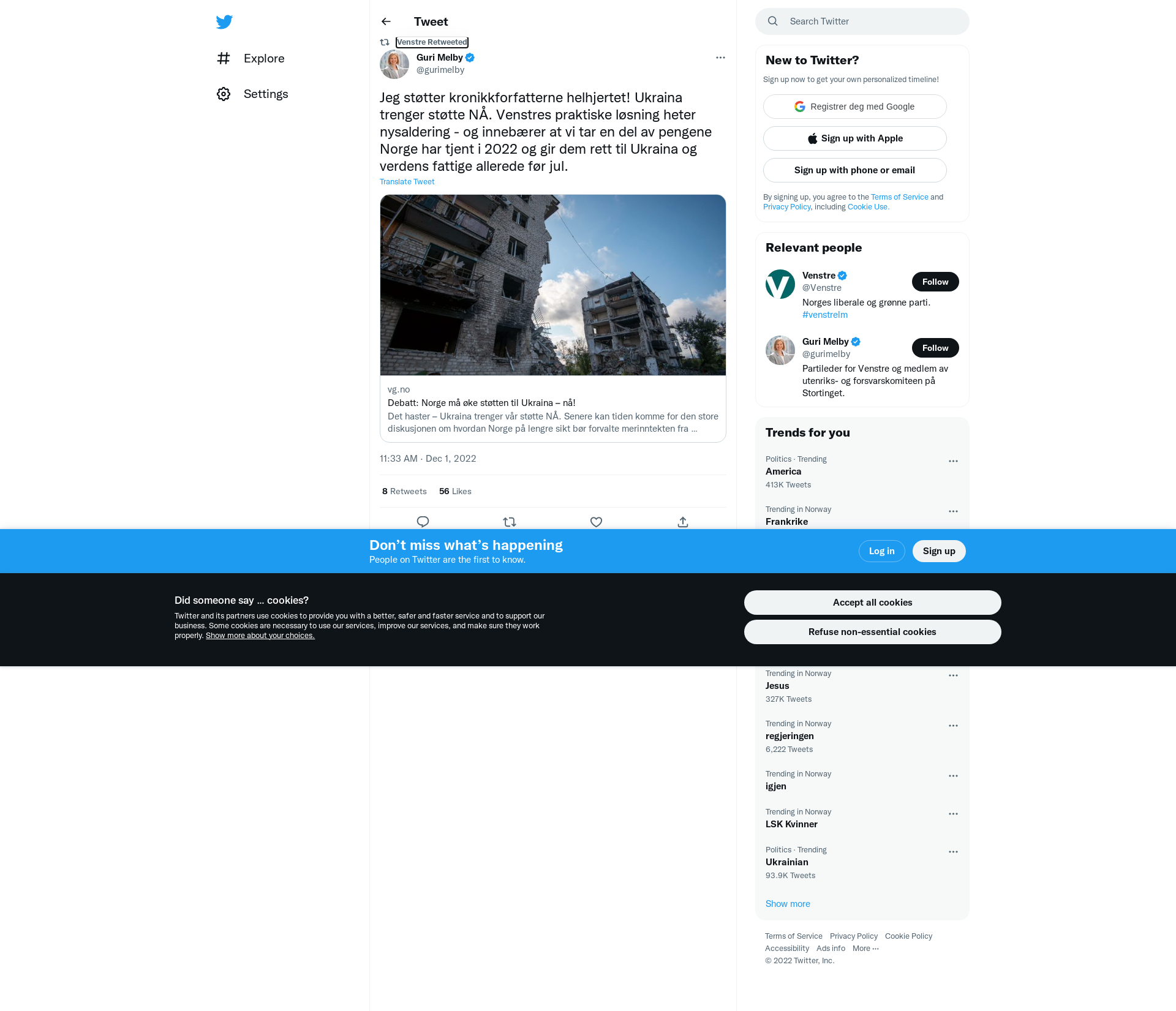 RT @gurimelby: Jeg støtter kronikkforfatterne helhjertet! Ukraina trenger støtte NÅ. Venstres praktiske løsning heter nysaldering - og innebærer at vi tar en del av pengene Norge har tjent i 2022 og gir dem rett til Ukraina og verdens fattige allerede før jul. https://t.co/WMXueOwTEk