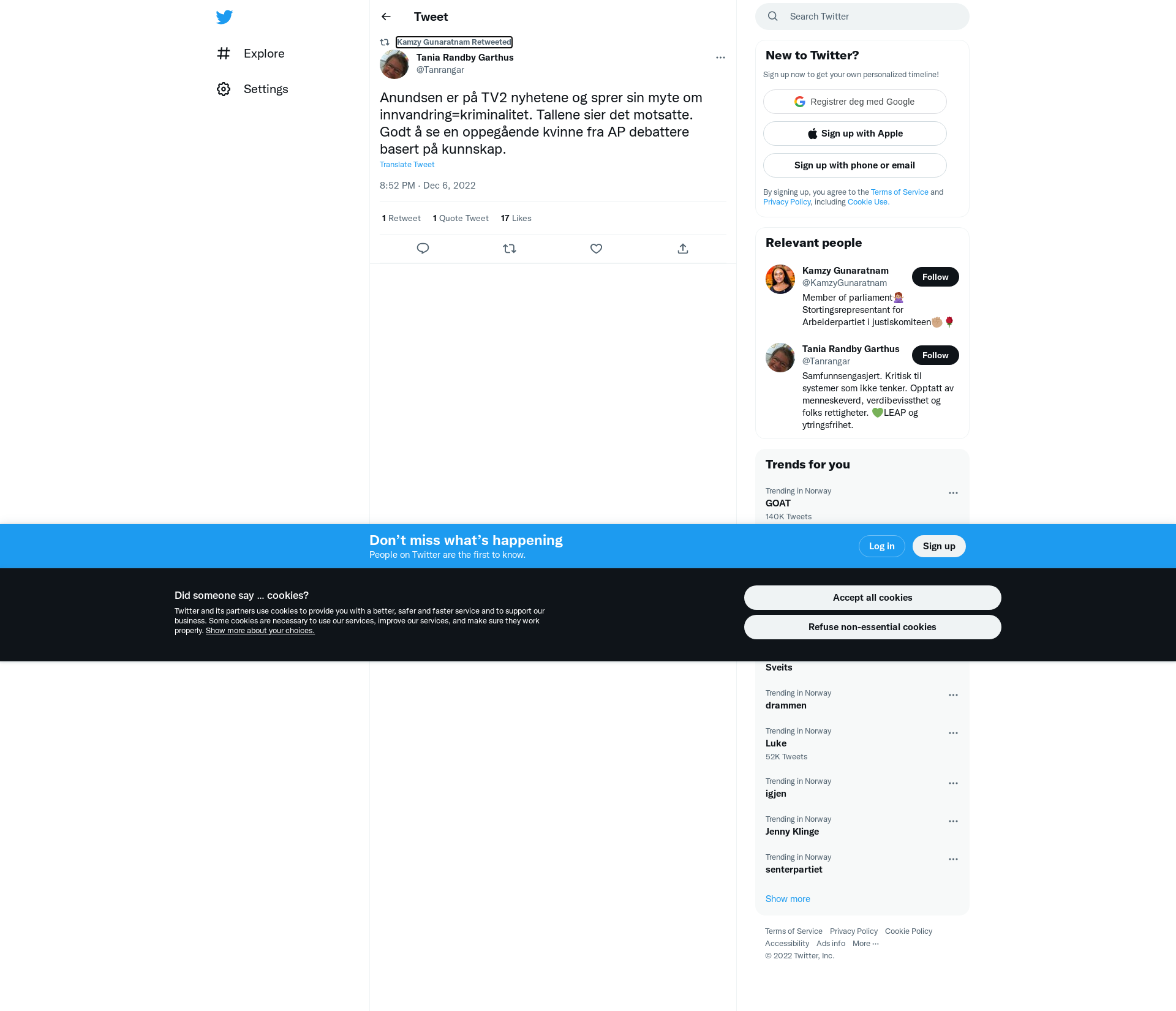 RT @Tanrangar: Anundsen er på TV2 nyhetene og sprer sin myte om innvandring=kriminalitet. Tallene sier det motsatte. Godt å se en oppegående kvinne fra AP debattere basert på kunnskap.
