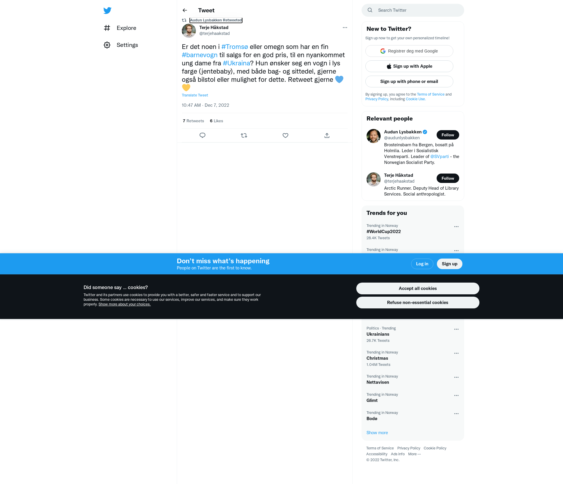 RT @terjehaakstad: Er det noen i #Tromsø eller omegn som har en fin #barnevogn til salgs for en god pris, til en nyankommet ung dame fra #Ukraina? Hun ønsker seg en vogn i lys farge (jentebaby), med både bag- og sittedel, gjerne også bilstol eller mulighet for dette. Retweet gjerne 💙💛