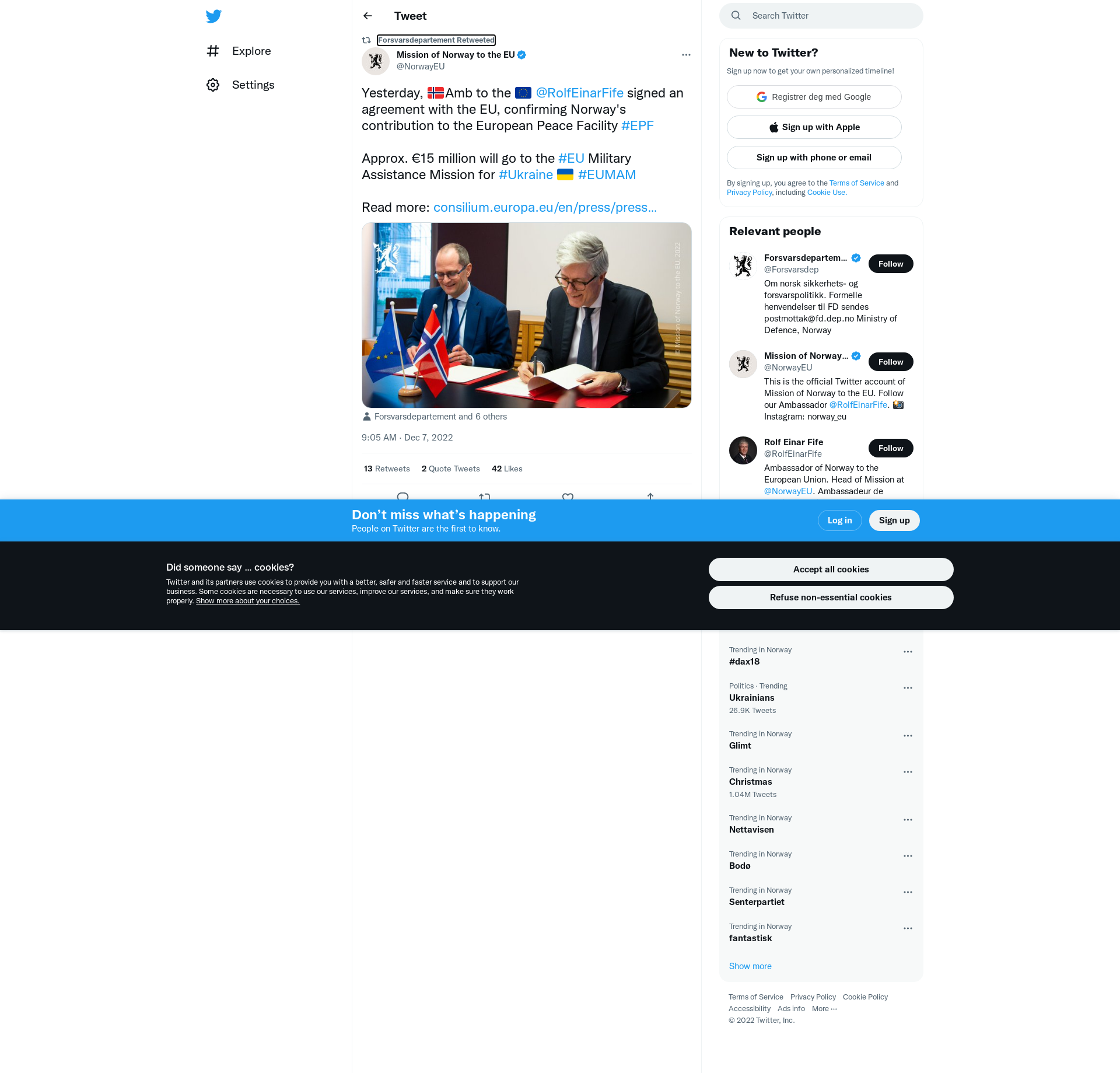 RT @NorwayEU: Yesterday, 🇳🇴Amb to the 🇪🇺 @RolfEinarFife signed an agreement with the EU, confirming Norway's contribution to the European Peace Facility #EPF\n\nApprox. €15 million will go to the #EU Military Assistance Mission for #Ukraine 🇺🇦 #EUMAM\n\nRead more: https://t.co/rD6AiEVuns https://t.co/hSGuxDdRwi