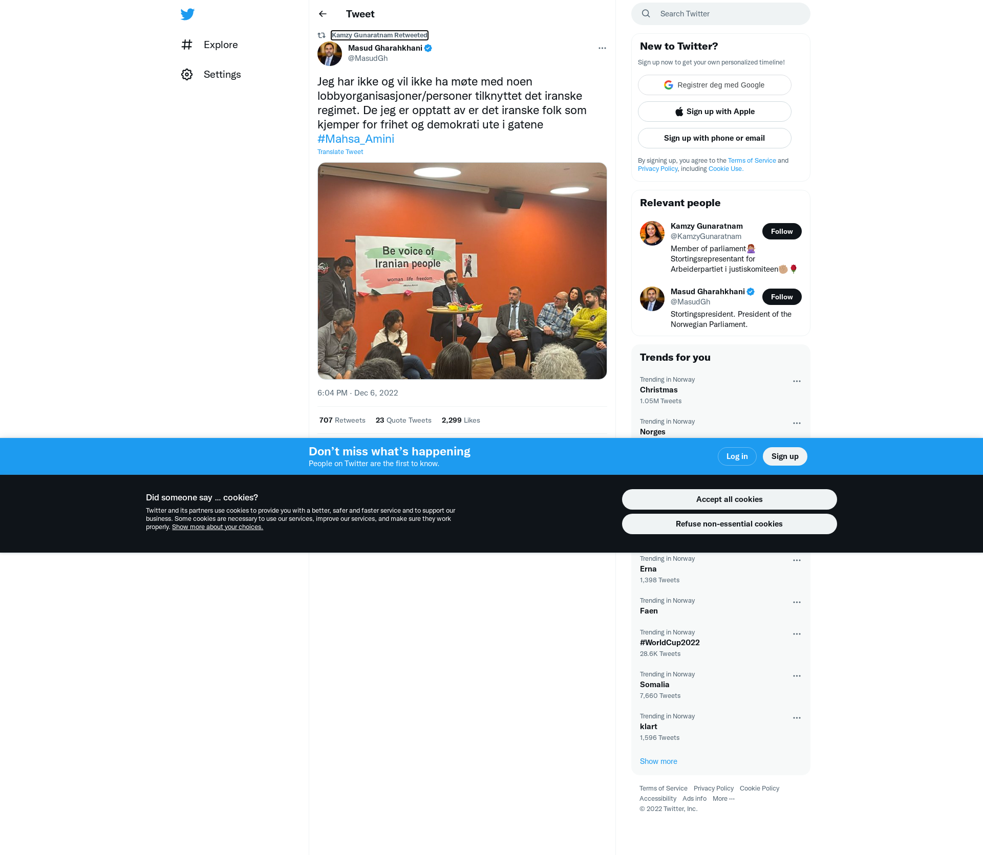 RT @MasudGh: Jeg har ikke og vil ikke ha møte med noen lobbyorganisasjoner/personer tilknyttet det iranske regimet. De jeg er opptatt av er det iranske folk som kjemper for frihet og demokrati ute i gatene #Mahsa_Amini https://t.co/qjYaWtKB9A