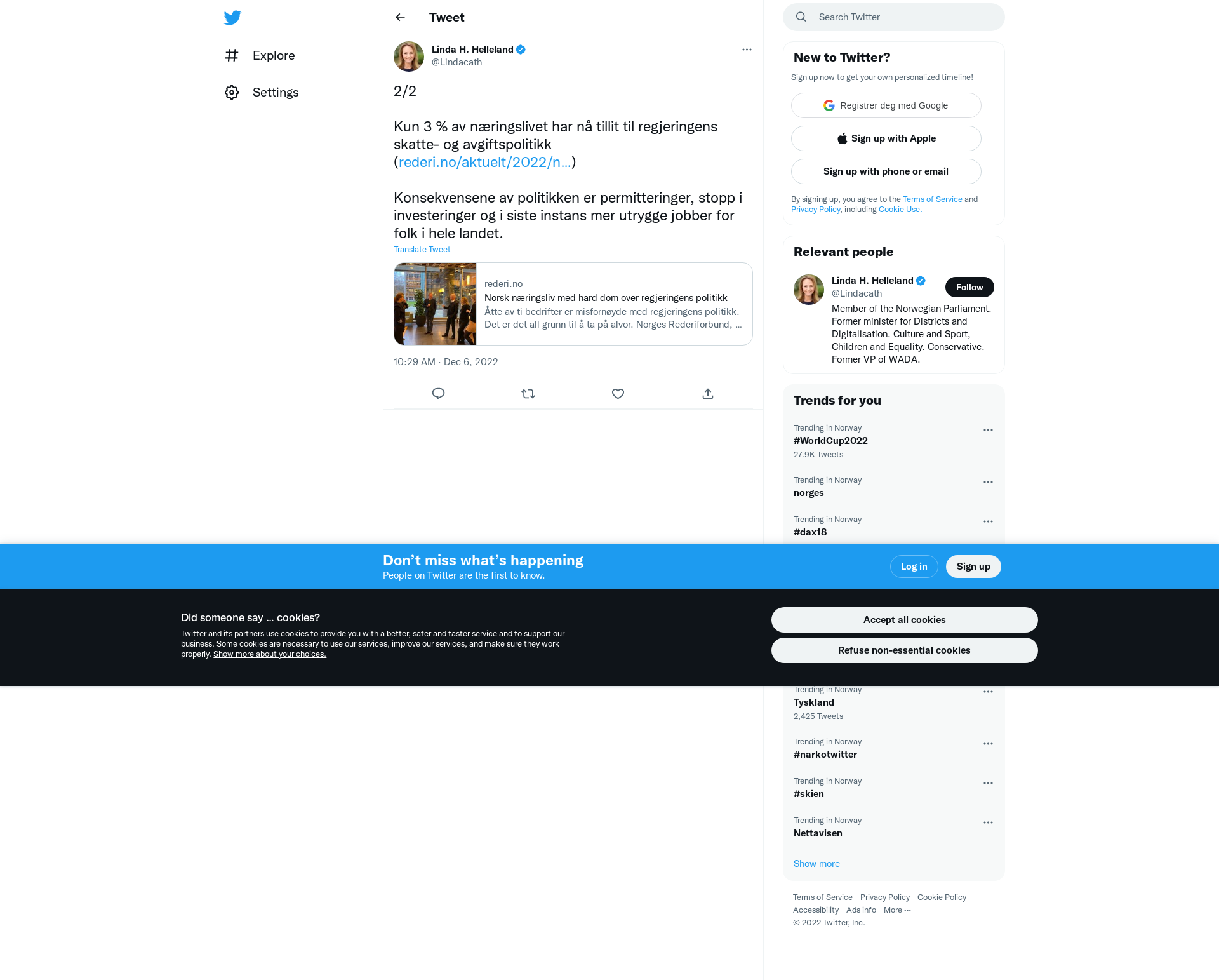 Åtte av ti bedrifter er misfornøyde med regjeringens politikk. Det er det all grunn til å ta på alvor. Norges Rederiforbund, Finans Norge, Virke og NHO representerer bredden av norske bedrifter i hele landet. Vi har spurt medlemsbedriften …