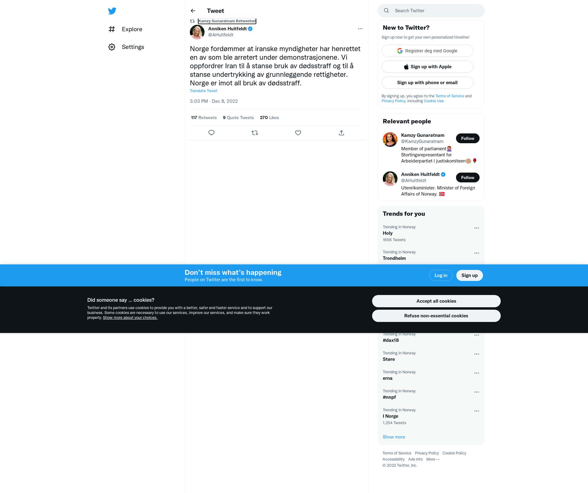 RT @AHuitfeldt: Norge fordømmer at iranske myndigheter har henrettet en av som ble arretert under demonstrasjonene. Vi oppfordrer Iran til å stanse bruk av dødsstraff og til å stanse undertrykking av grunnleggende rettigheter. Norge er imot all bruk av dødsstraff.