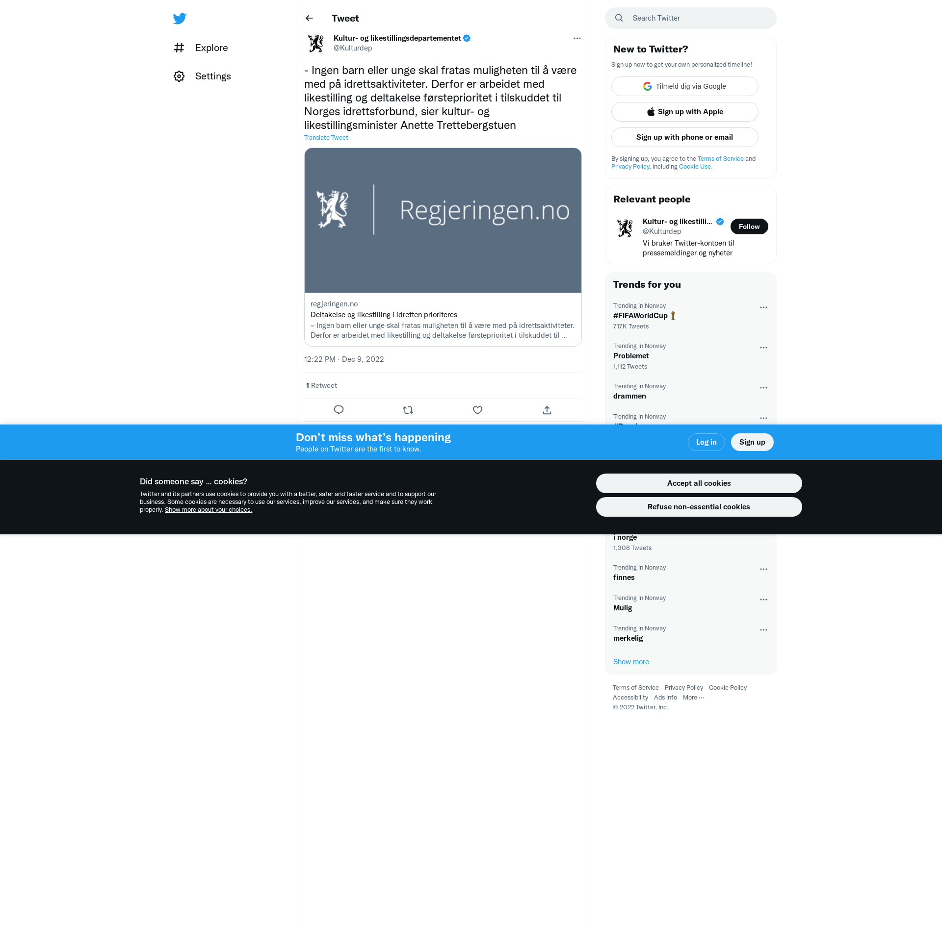– Ingen barn eller unge skal fratas muligheten til å være med på idrettsaktiviteter. Derfor er arbeidet med likestilling og deltakelse førsteprioritet i tilskuddet til Norges idrettsforbund, sier kultur- og likestillingsminister Anette Trettebergstuen.