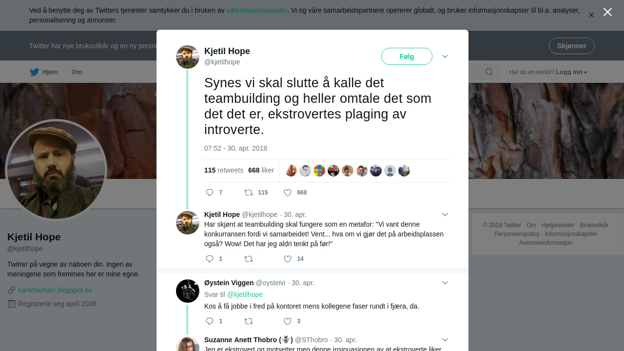 RT @kjetilhope: Synes vi skal slutte å kalle det teambuilding og heller omtale det som det det er, ekstrovertes plaging av introverte.