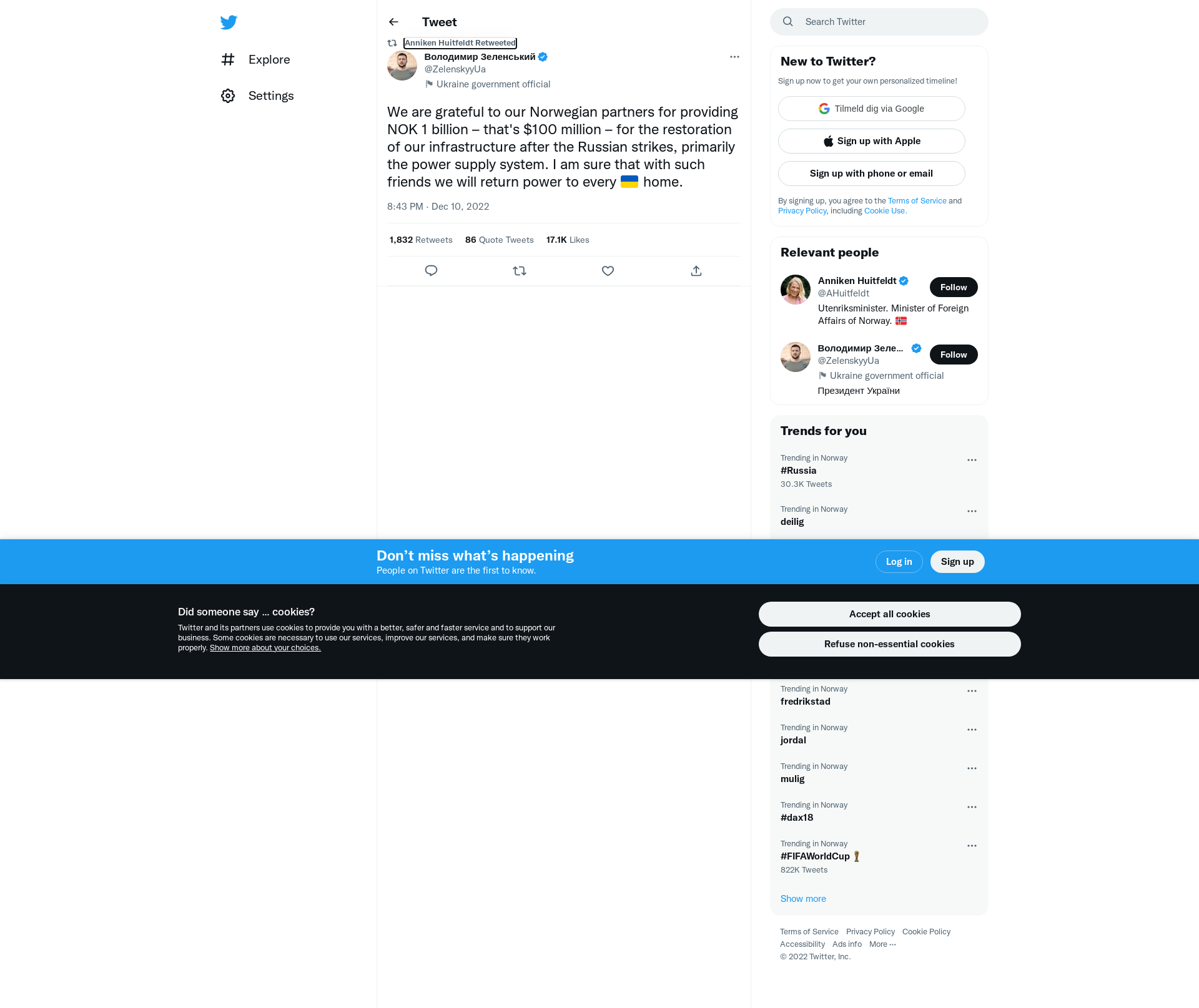 RT @ZelenskyyUa: We are grateful to our Norwegian partners for providing NOK 1 billion – that's $100 million – for the restoration of our infrastructure after the Russian strikes, primarily the power supply system. I am sure that with such friends we will return power to every 🇺🇦 home.