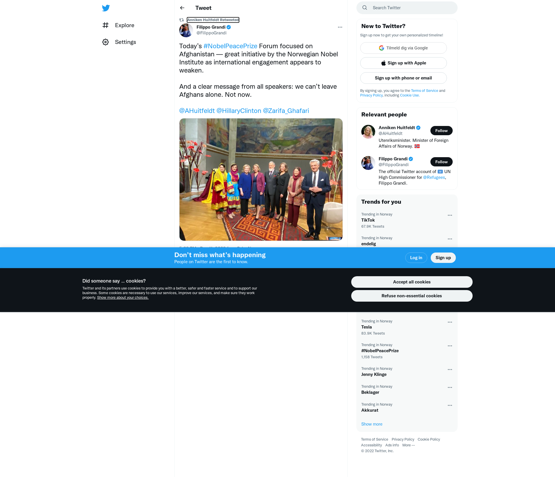 RT @FilippoGrandi: Today’s #NobelPeacePrize Forum focused on Afghanistan — great initiative by the Norwegian Nobel Institute as international engagement appears to weaken.\n\nAnd a clear message from all speakers: we can’t leave Afghans alone. Not now.\n\n@AHuitfeldt @HillaryClinton @Zarifa_Ghafari https://t.co/iHs6449OMi