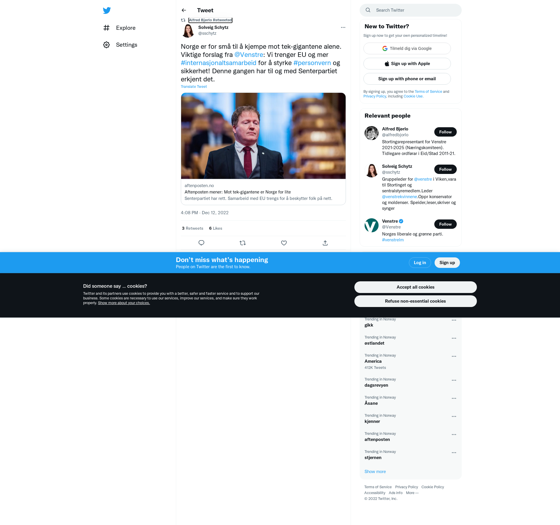 RT @sschytz: Norge er for små til å kjempe mot tek-gigantene alene. Viktige forslag fra @Venstre: Vi trenger EU og mer #internasjonaltsamarbeid for å styrke #personvern og sikkerhet! Denne gangen har til og med Senterpartiet erkjent det. https://t.co/GfW8b9lv6M