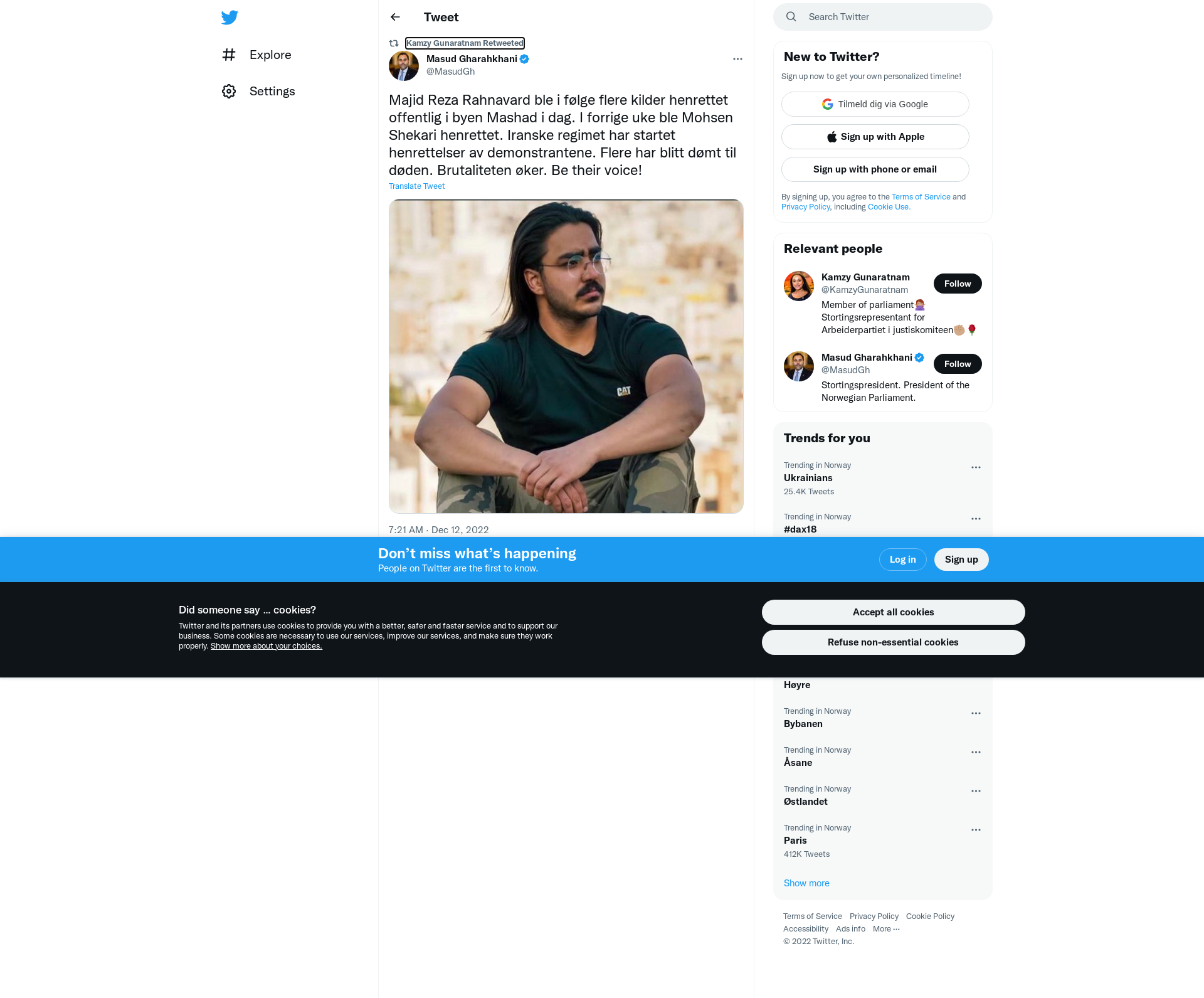 RT @MasudGh: Majid Reza Rahnavard ble i følge flere kilder henrettet offentlig i byen Mashad i dag. I forrige uke ble Mohsen Shekari henrettet. Iranske regimet har startet henrettelser av demonstrantene. Flere har blitt dømt til døden. Brutaliteten øker. Be their voice! https://t.co/klDFQoUWJN