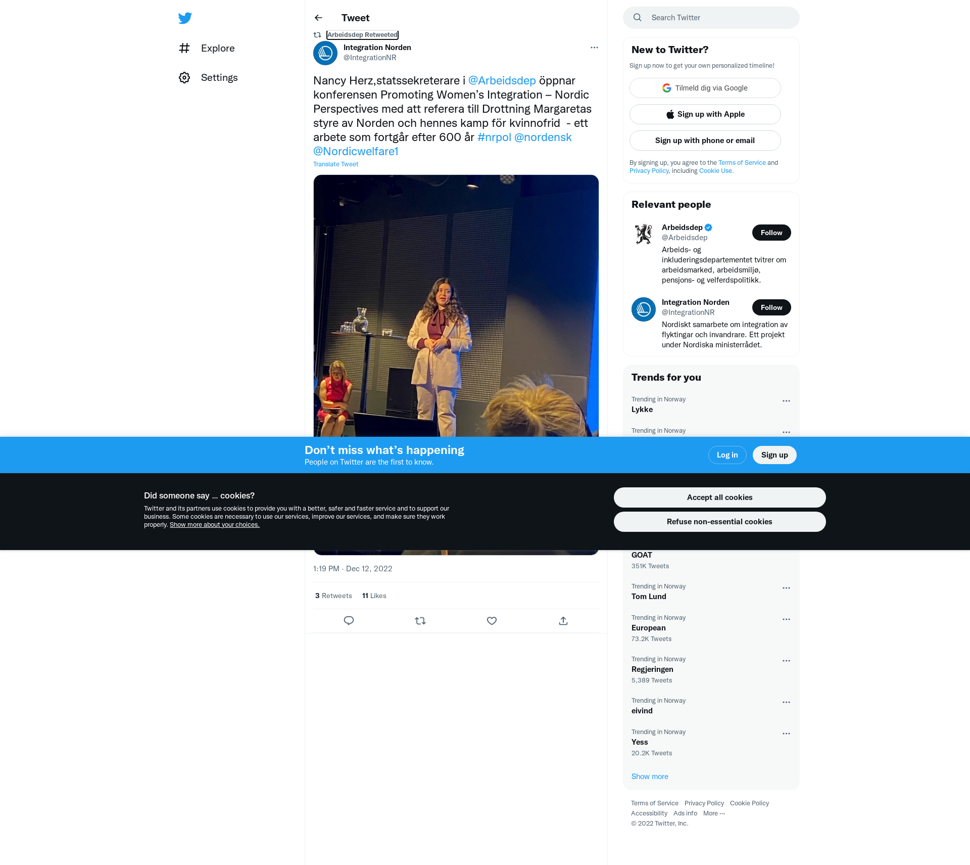 RT @IntegrationNR: Nancy Herz,statssekreterare i @Arbeidsdep öppnar konferensen Promoting Women’s Integration – Nordic Perspectives med att referera till Drottning Margaretas styre av Norden och hennes kamp för kvinnofrid - ett arbete som fortgår efter 600 år #nrpol @nordensk\n@Nordicwelfare1 https://t.co/7tr8ui59Uj