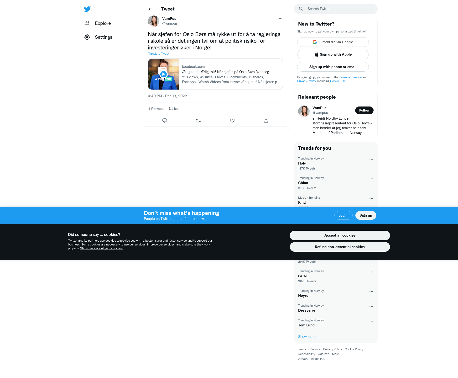 210 views, 46 likes, 1 loves, 9 comments, 11 shares, Facebook Watch Videos from Høyre: Ærlig talt! Når sjefen på Oslo Børs føler seg forpliktet til å reagere på regjeringens politikk fordi den har...