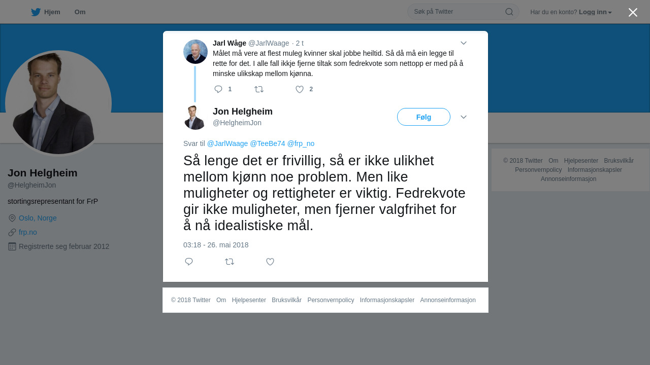 @JarlWaage @TeeBe74 @frp_no Så lenge det er frivillig, så er ikke ulikhet mellom kjønn noe problem. Men like muligheter og rettigheter er viktig. Fedrekvote gir ikke muligheter, men fjerner valgfrihet for å nå idealistiske mål.