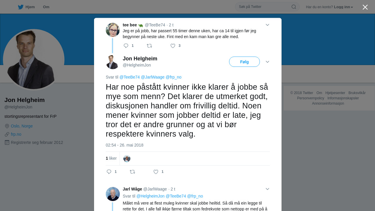 @TeeBe74 @JarlWaage @frp_no Har noe påstått kvinner ikke klarer å jobbe så mye som menn? Det klarer de utmerket godt, diskusjonen handler om frivillig deltid. Noen mener kvinner som jobber deltid er late, jeg tror det er andre grunner og at vi bør respektere kvinners valg.
