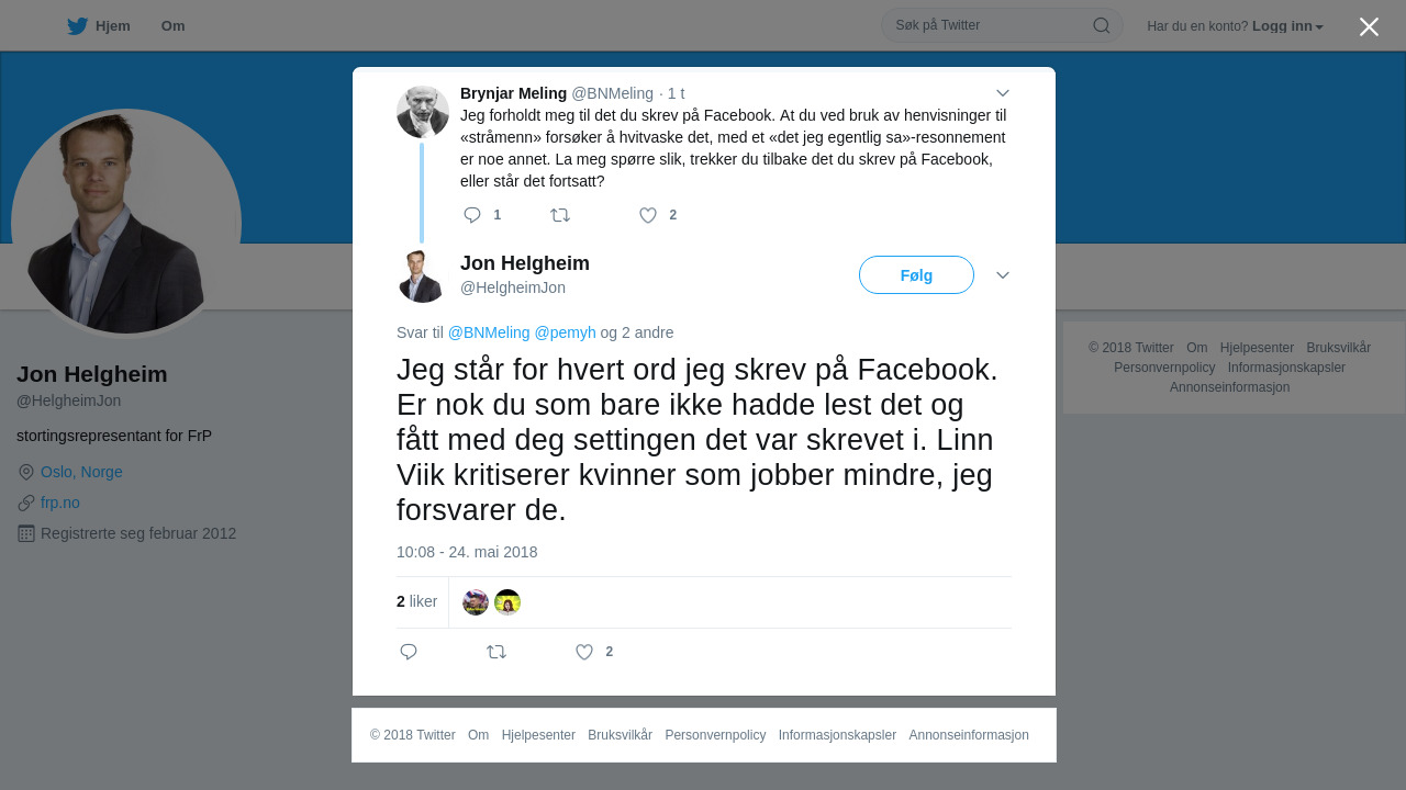 @BNMeling @pemyh @frp_no @Real_Frp Jeg står for hvert ord jeg skrev på Facebook. Er nok du som bare ikke hadde lest det og fått med deg settingen det var skrevet i. Linn Viik kritiserer kvinner som jobber mindre, jeg forsvarer de.