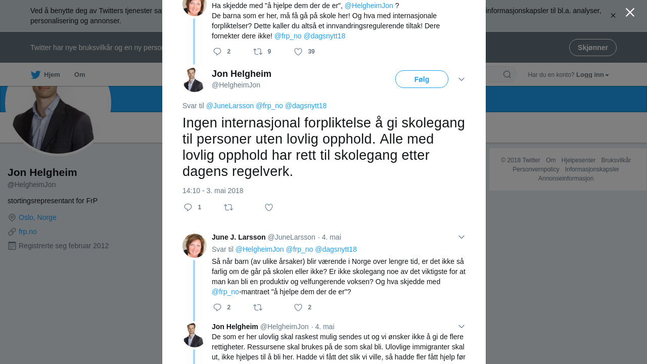 @JuneLarsson @frp_no @dagsnytt18 Ingen internasjonal forpliktelse å gi skolegang til personer uten lovlig opphold. Alle med lovlig opphold har rett til skolegang etter dagens regelverk.