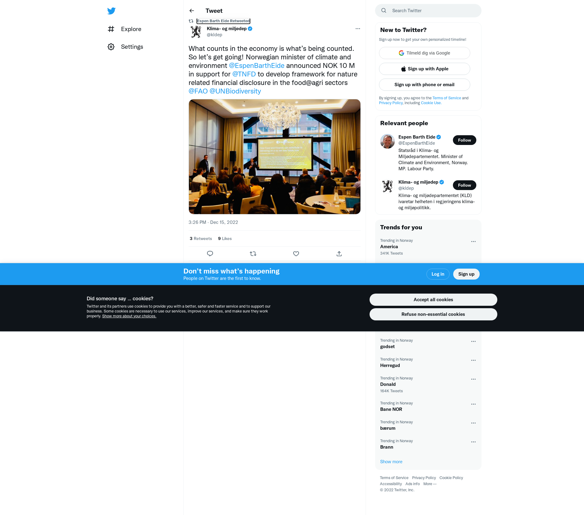 RT @kldep: What counts in the economy is what’s being counted. So let’s get going! Norwegian minister of climate and environment @EspenBarthEide announced NOK 10 M in support for @TNFD to develop framework for nature related financial disclosure in the food@agri sectors @FAO @UNBiodiversity https://t.co/oyUtIbINds