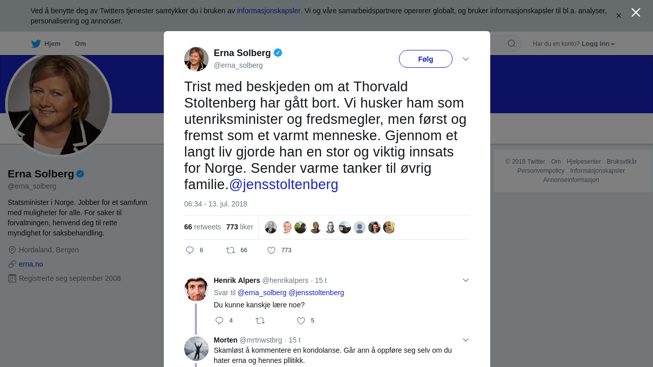 RT @erna_solberg: Trist med beskjeden om at Thorvald Stoltenberg har gått bort. Vi husker ham som utenriksminister og fredsmegler, me… https://t.co/RFxWoRYb7l