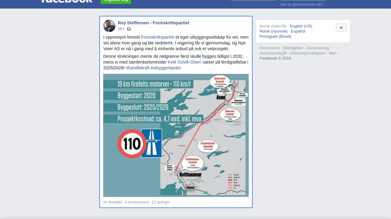 I opposisjon foreslo Fremskrittspartiet et eget utbyggingsselskap for vei, men sto alene hver gang og ble nedstemt. I regjering får vi gjennomslag, og Nye Veier AS er nå i gang med å innhente anbud på nok et veiprosjekt.