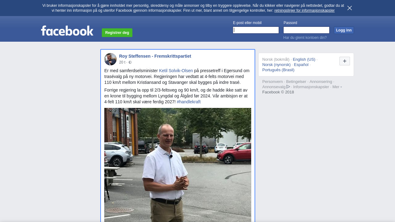 Er med samferdselsminister Ketil Solvik-Olsen på pressetreff i Egersund om trasévalg på ny motorvei. Regjeringen har vedtatt at 4-felts motorvei med 110 km/t mellom Kristiansand og Stavanger skal bygges på indre trasé.