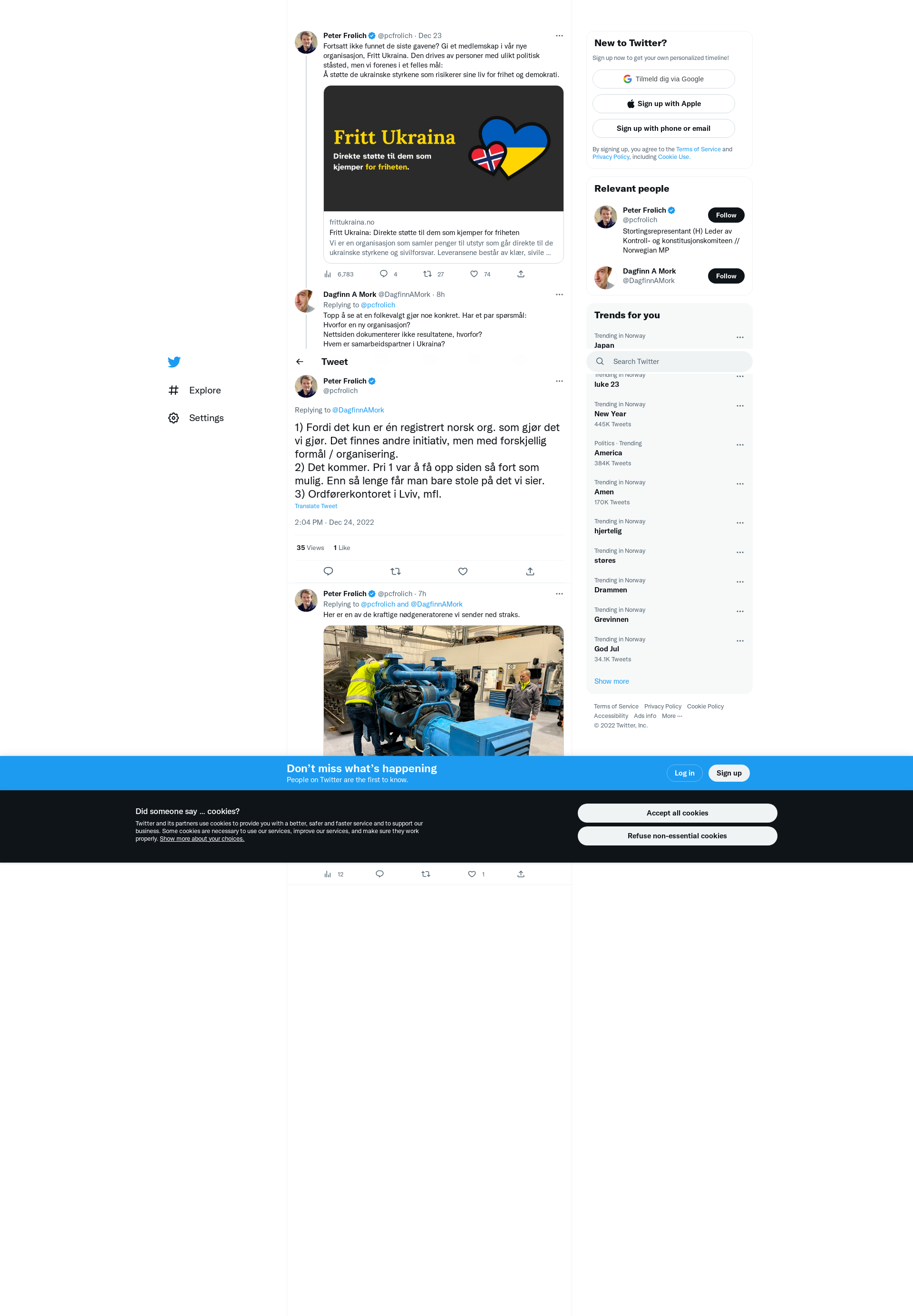 @DagfinnAMork 1) Fordi det kun er én registrert norsk org. som gjør det vi gjør. Det finnes andre initiativ, men med forskjellig formål / organisering.\n2) Det kommer. Pri 1 var å få opp siden så fort som mulig. Enn så lenge får man bare stole på det vi sier.\n3) Ordførerkontoret i Lviv, mfl.