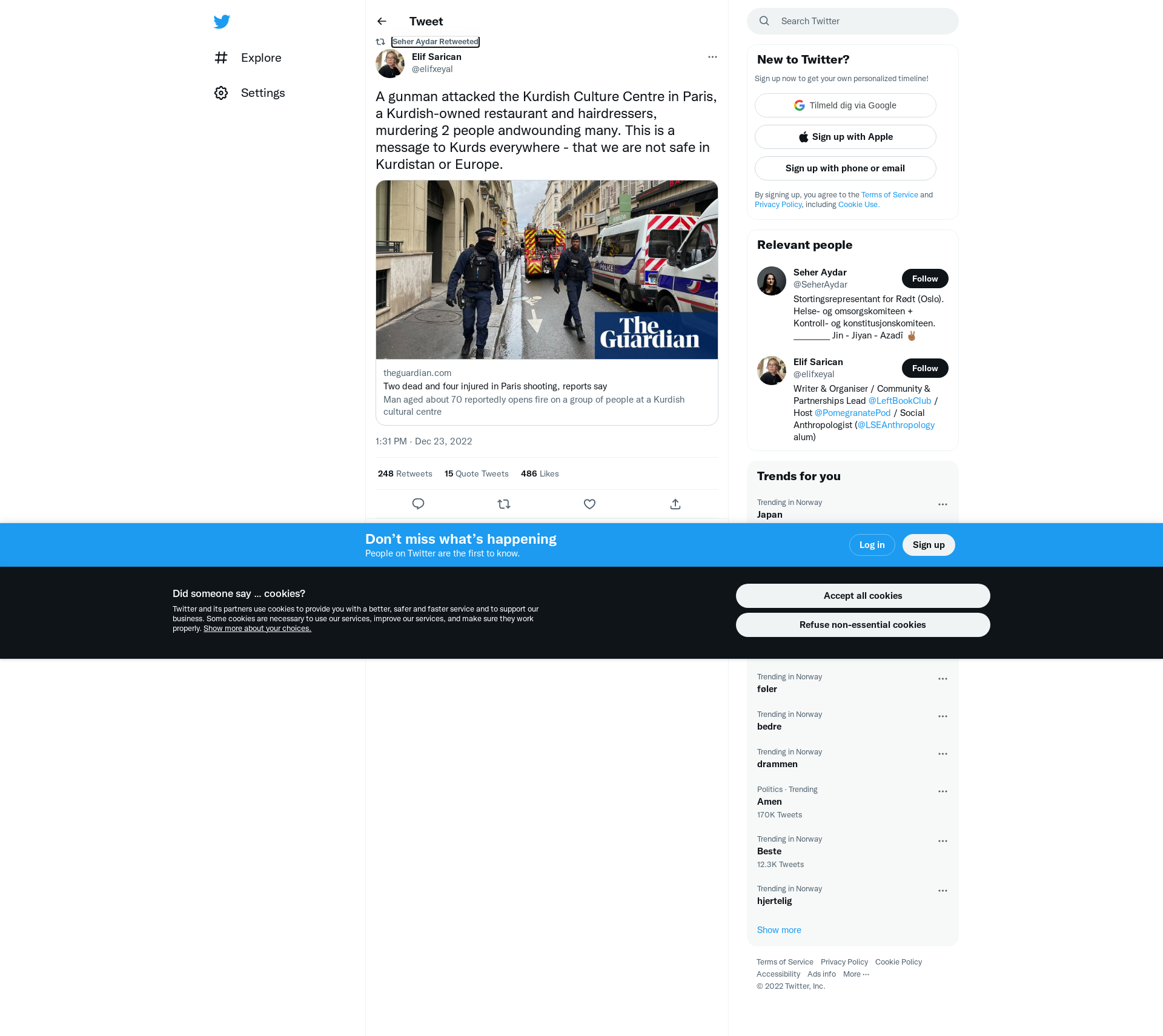 RT @elifxeyal: A gunman attacked the Kurdish Culture Centre in Paris, a Kurdish-owned restaurant and hairdressers, murdering 2 people andwounding many. This is a message to Kurds everywhere - that we are not safe in Kurdistan or Europe. https://t.co/xihmZ6CIof