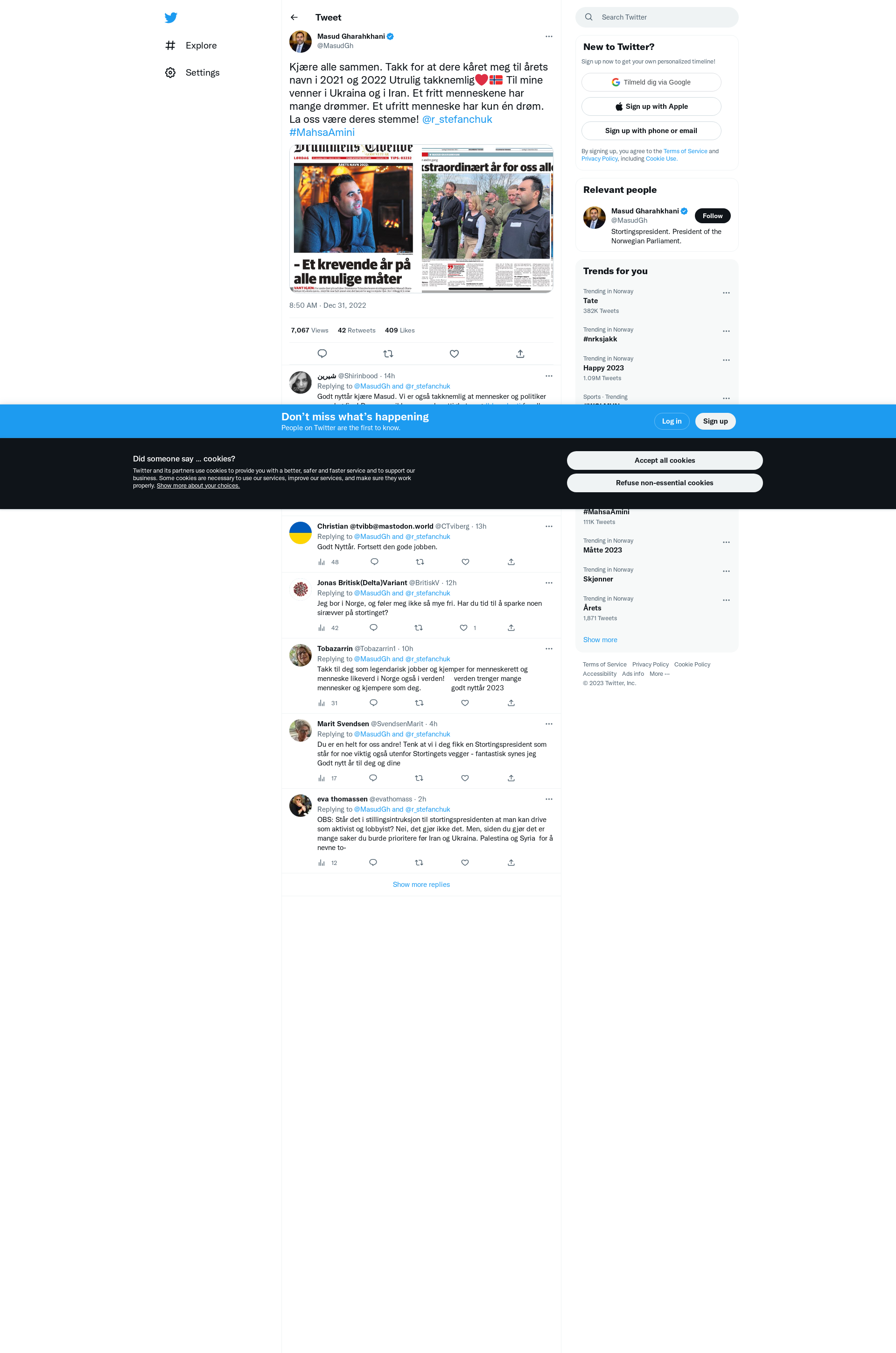 Kjære alle sammen. Takk for at dere kåret meg til årets navn i 2021 og 2022 Utrulig takknemlig❤️🇳🇴 Til mine venner i Ukraina og i Iran. Et fritt menneskene har mange drømmer. Et ufritt menneske har kun én drøm. La oss være deres stemme! @r_stefanchuk #MahsaAmini https://t.co/WRbUlPQD8V