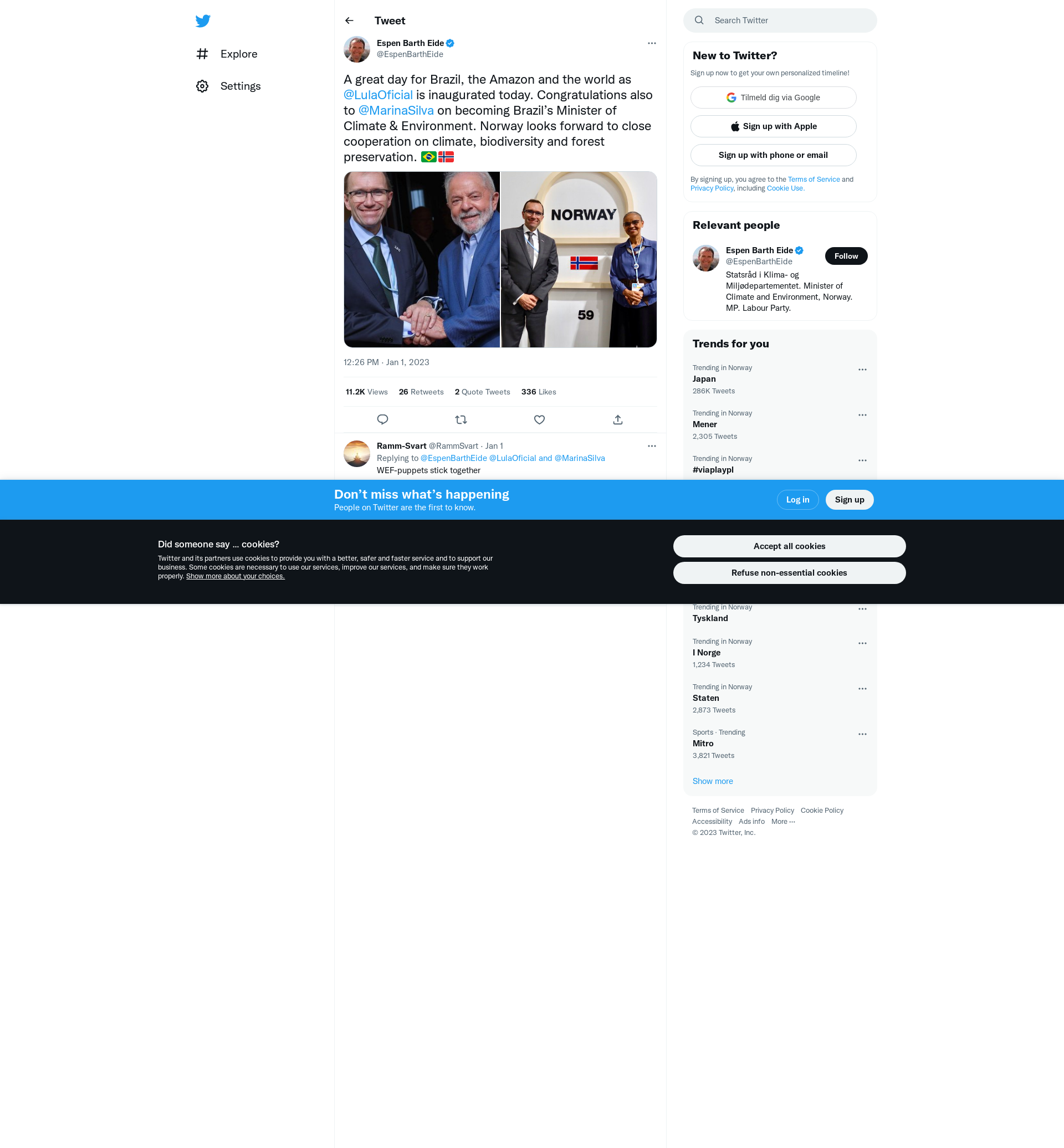 A great day for Brazil, the Amazon and the world as @LulaOficial is inaugurated today. Congratulations also to @MarinaSilva on becoming Brazil’s Minister of Climate & Environment. Norway looks forward to close cooperation on climate, biodiversity and forest preservation. 🇧🇷🇳🇴 https://t.co/cyJtBRiQxQ
