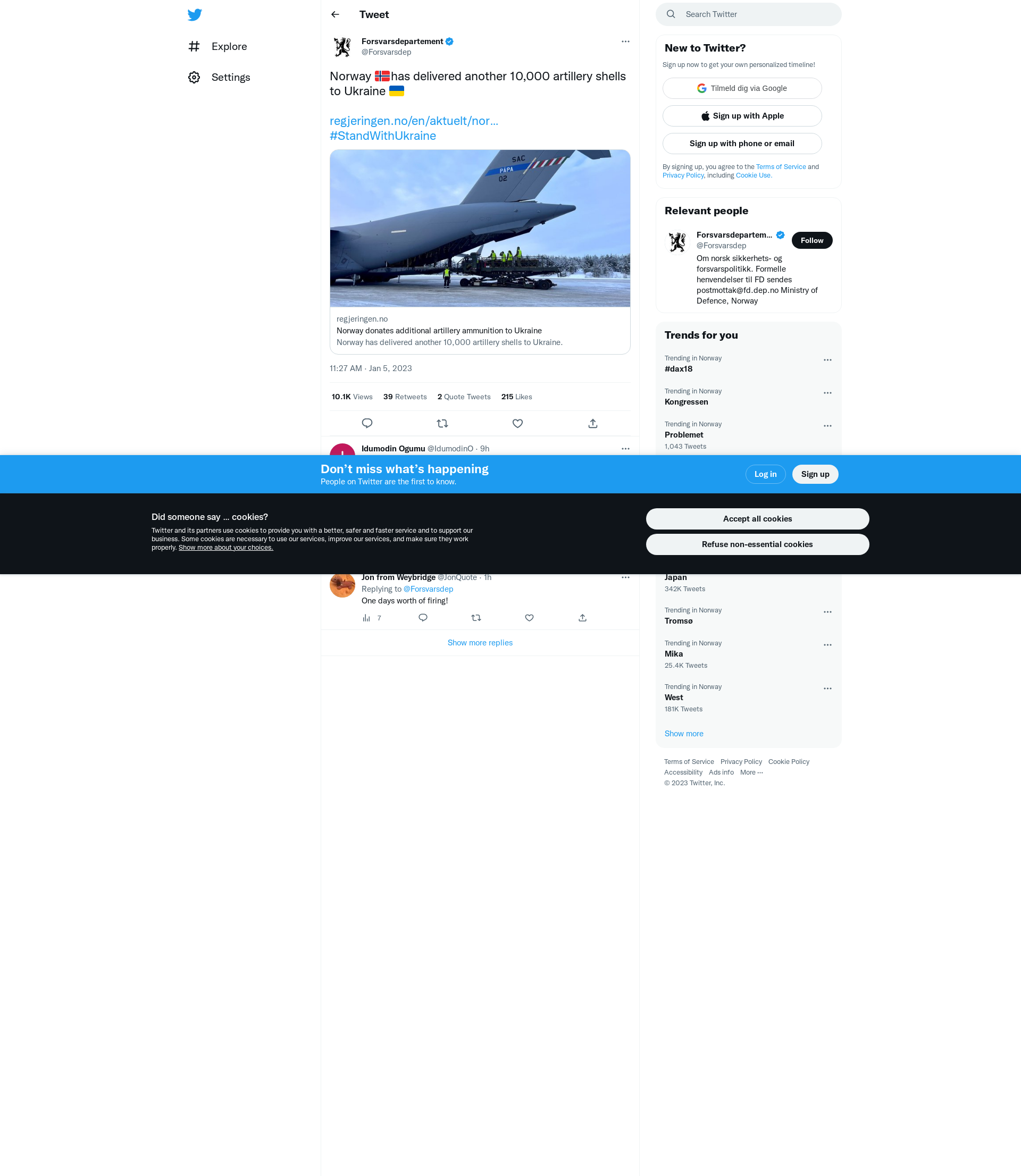 Norway 🇳🇴has delivered another 10,000 artillery shells to Ukraine 🇺🇦\n\nhttps://t.co/eQ7uVClZGU\n#StandWithUkraine