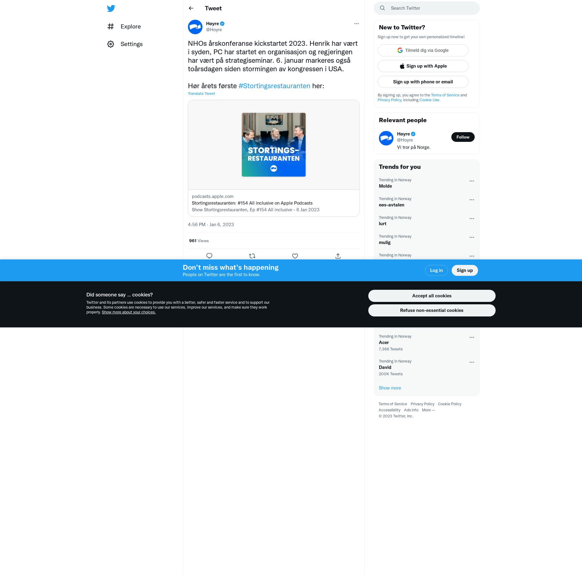 NHOs årskonferanse kickstartet 2023. Henrik har vært i syden, PC har startet en organisasjon og regjeringen har vært på strategiseminar. 6. januar markeres også toårsdagen siden stormingen av kongressen i USA.\n\nHør årets første #Stortingsrestauranten her: https://t.co/N4RoWqFtNu