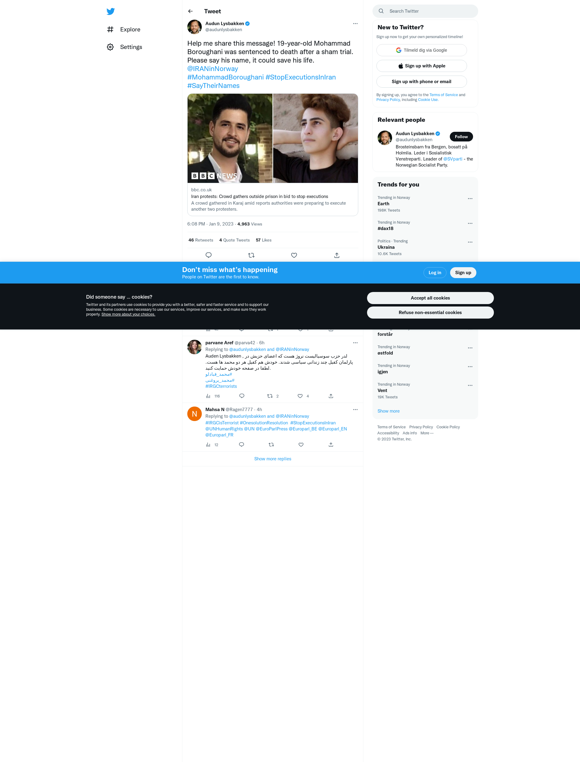 Help me share this message! 19-year-old Mohammad Boroughani was sentenced to death after a sham trial. Please say his name, it could save his life. @IRANinNorway\n#MohammadBoroughani #StopExecutionsInIran #SayTheirNames https://t.co/Ks8pjAt3sQ