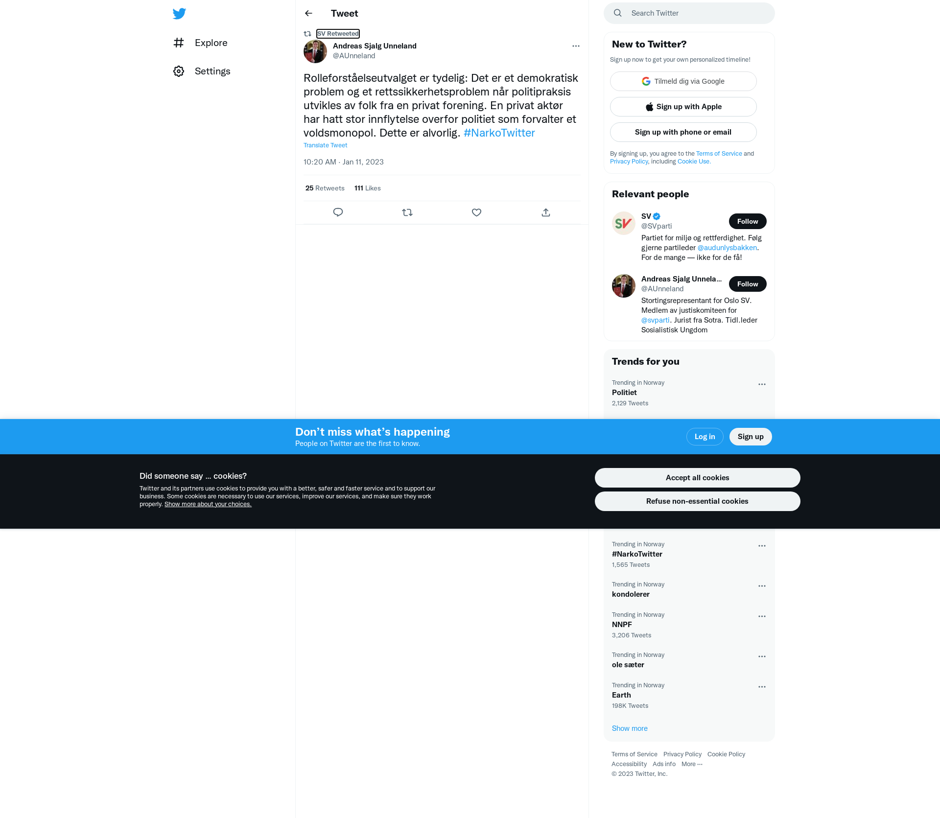 RT @AUnneland: Rolleforståelseutvalget er tydelig: Det er et demokratisk problem og et rettssikkerhetsproblem når politipraksis utvikles av folk fra en privat forening. En privat aktør har hatt stor innflytelse overfor politiet som forvalter et voldsmonopol. Dette er alvorlig. #NarkoTwitter