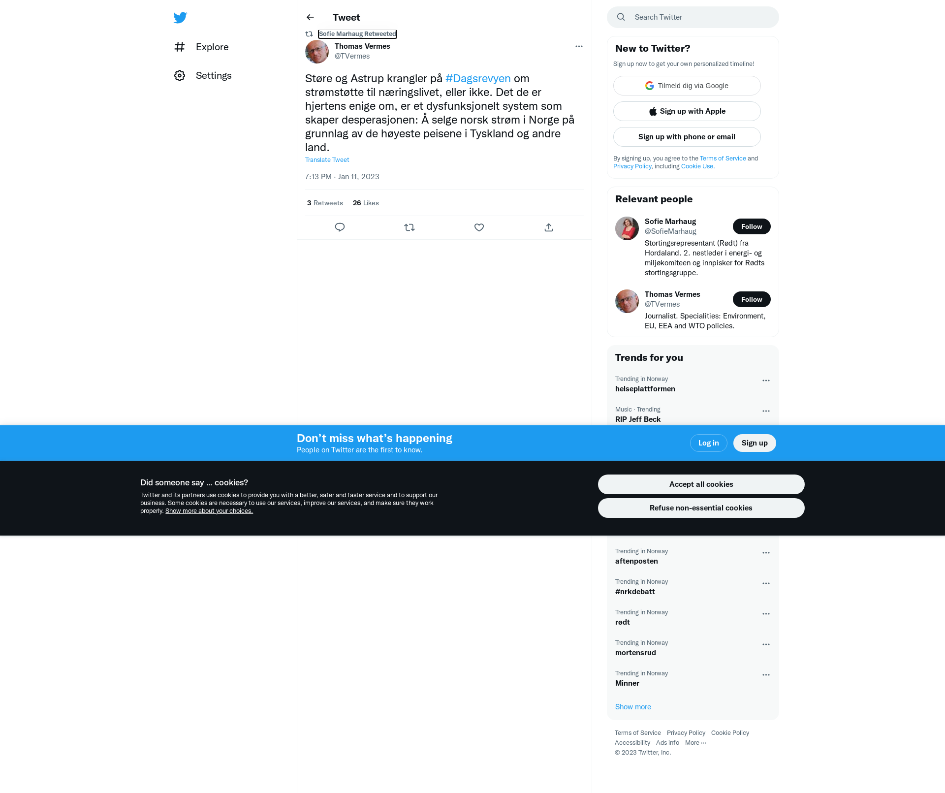 RT @TVermes: Støre og Astrup krangler på #Dagsrevyen om strømstøtte til næringslivet, eller ikke. Det de er hjertens enige om, er et dysfunksjonelt system som skaper desperasjonen: Å selge norsk strøm i Norge på grunnlag av de høyeste peisene i Tyskland og andre land.