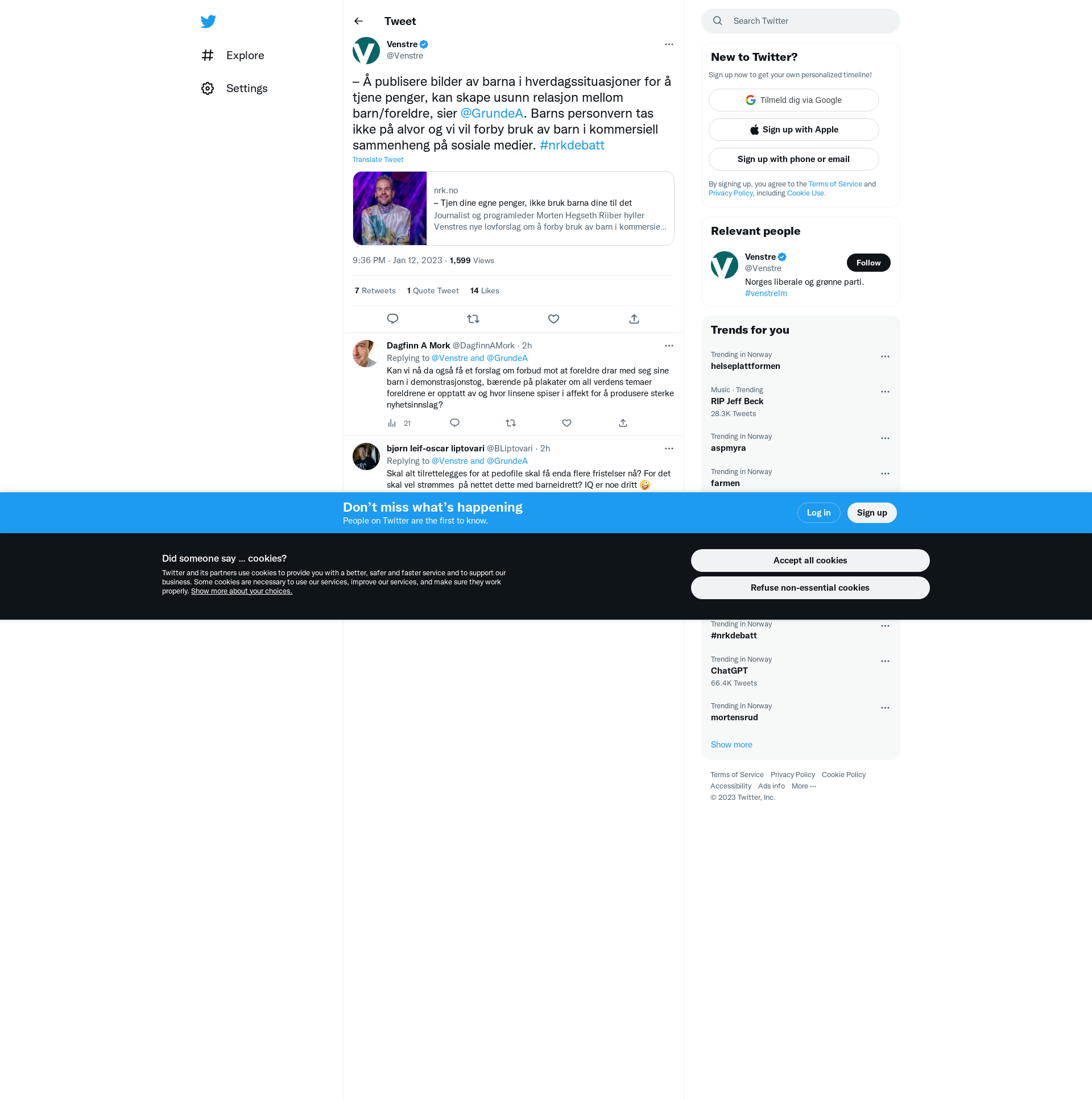 – Å publisere bilder av barna i hverdagssituasjoner for å tjene penger, kan skape usunn relasjon mellom barn/foreldre, sier @GrundeA. Barns personvern tas ikke på alvor og vi vil forby bruk av barn i kommersiell sammenheng på sosiale medier. #nrkdebatt https://t.co/ZzkgJfXVCJ
