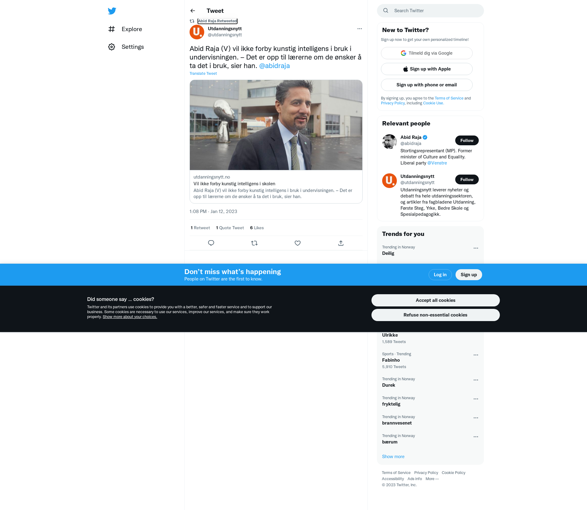 RT @utdanningsnytt: Abid Raja (V) vil ikke forby kunstig intelligens i bruk i undervisningen. – Det er opp til lærerne om de ønsker å ta det i bruk, sier han. @abidraja https://t.co/A5uXAgK2np