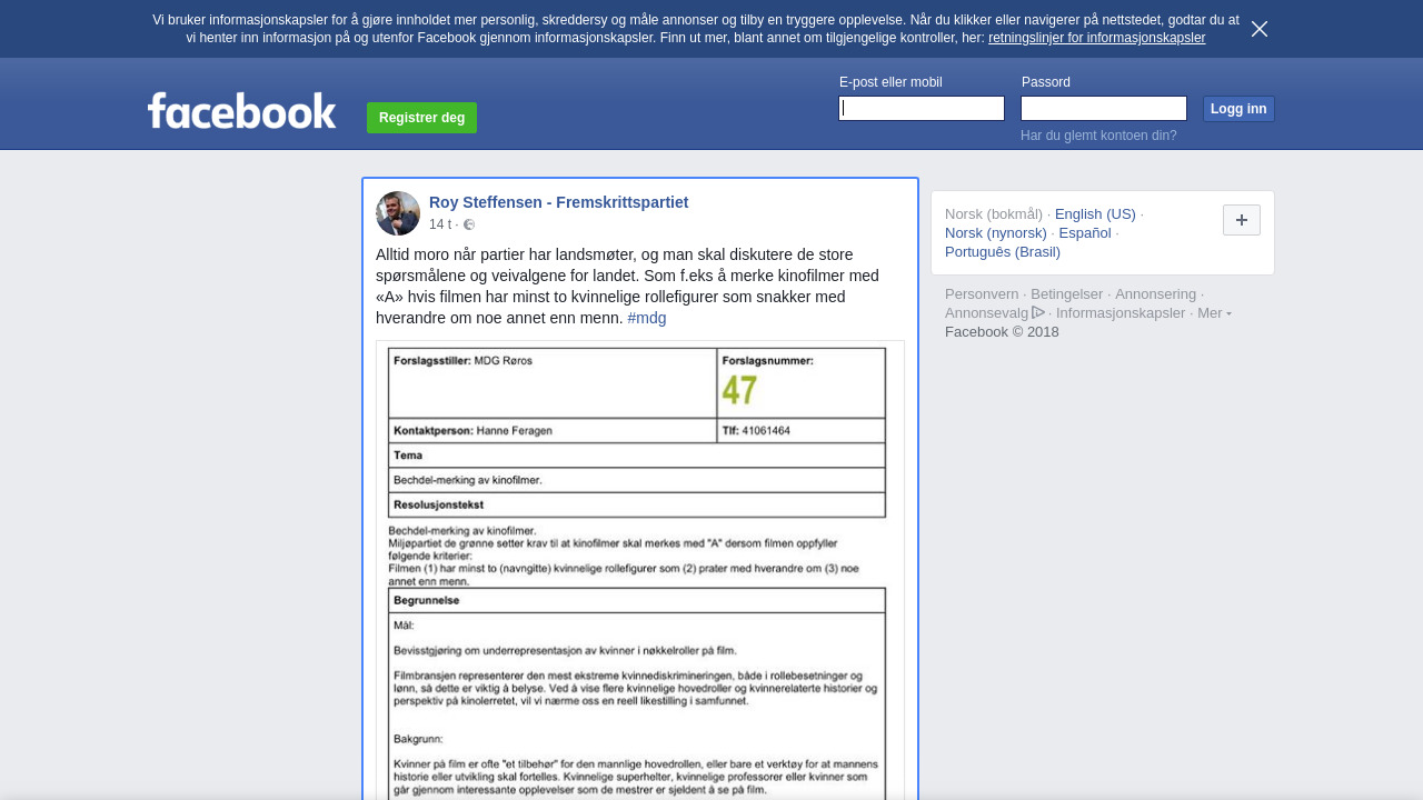 Alltid moro når partier har landsmøter, og man skal diskutere de store spørsmålene og veivalgene for landet. Som f.eks å merke kinofilmer med «A» hvis filmen har minst to kvinnelige rollefigurer som snakker med hverandre om noe annet enn menn. #mdg